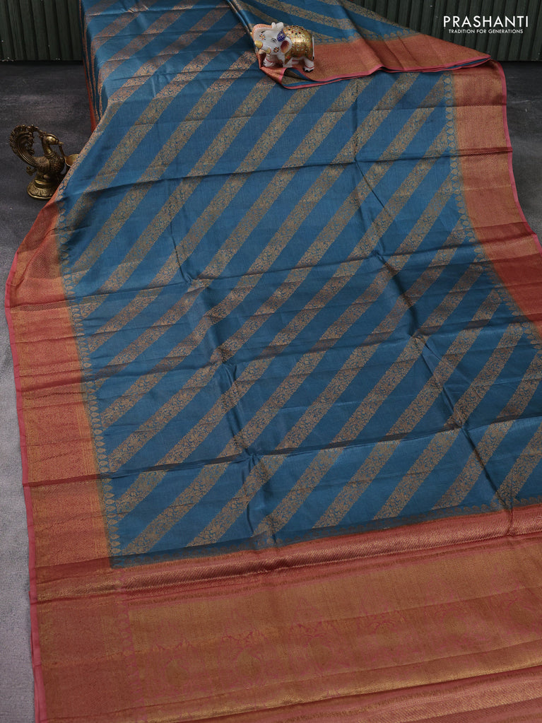 Banarasi tussar silk saree peacock blue and rustic orange with thread & zari woven buttas and woven border