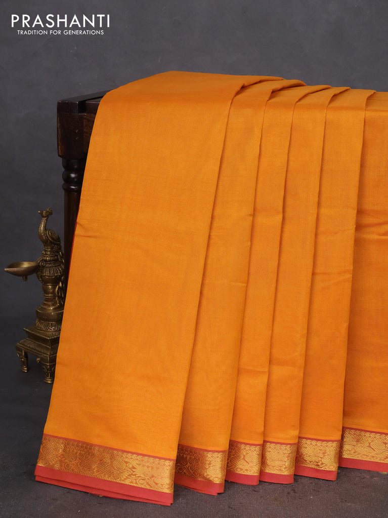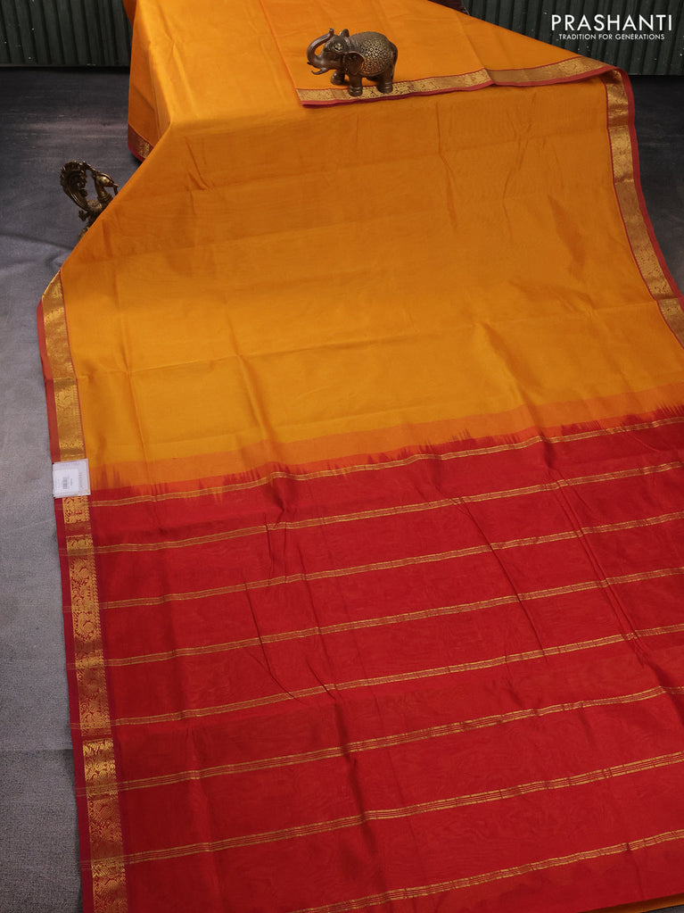 10 Yards silk cotton saree mustard yellow and red with plain body and annam zari woven border