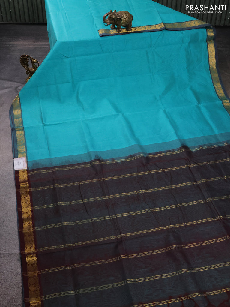 10 Yards silk cotton saree mehendi green and cs blue with plain body and zari woven korvai border