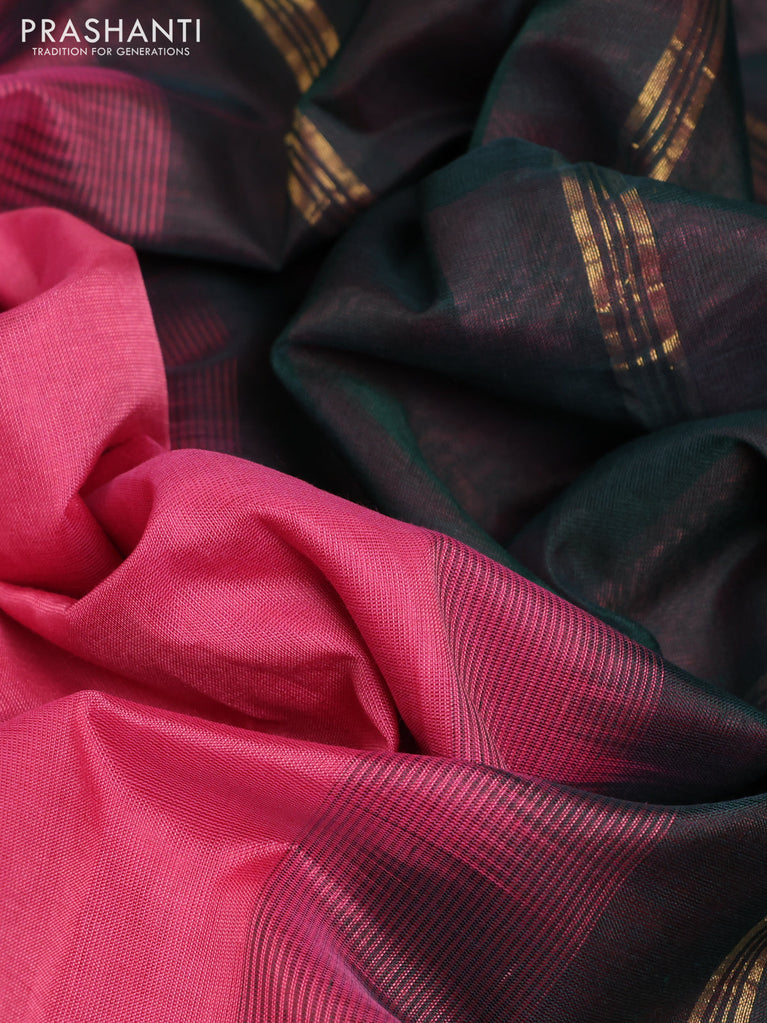 10 Yards silk cotton saree peach pink and bottle green with plain body and zari woven border