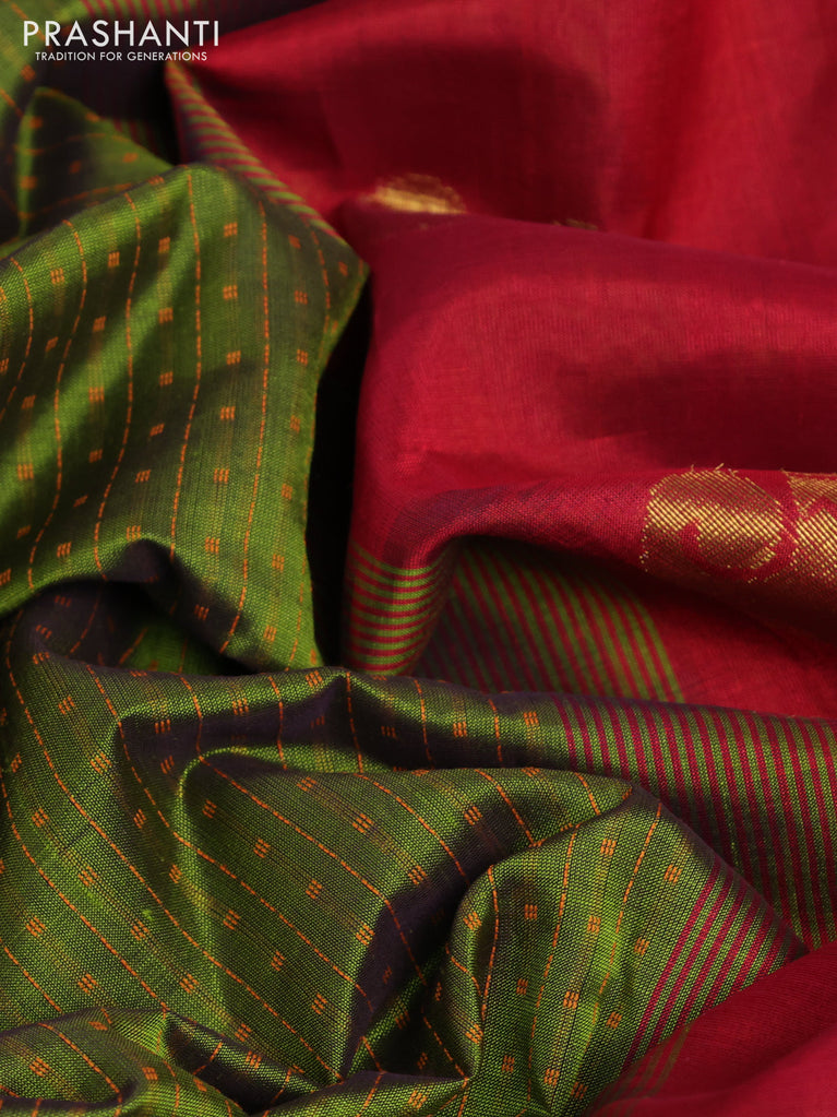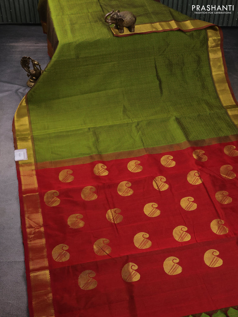 10 Yards silk cotton saree mehendi green and red with allover small zari checked pattern and zari woven border