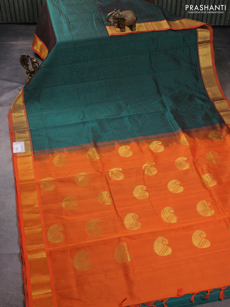 10 Yards silk cotton saree peacock green and orange with allover thread weaves and zari woven border