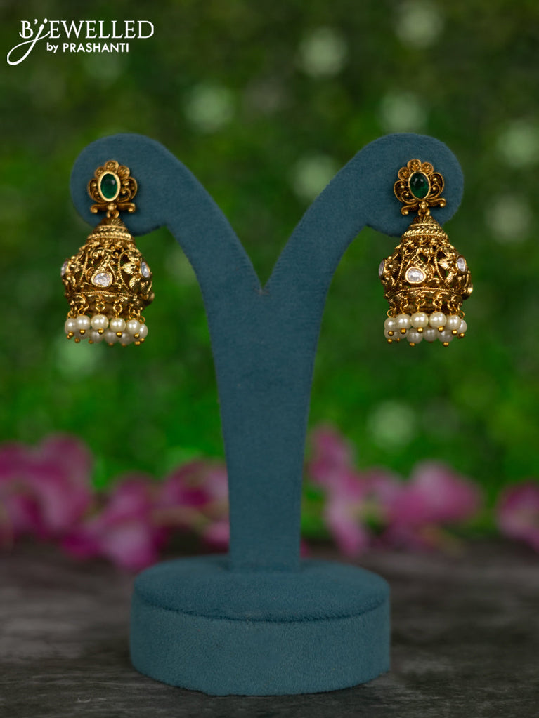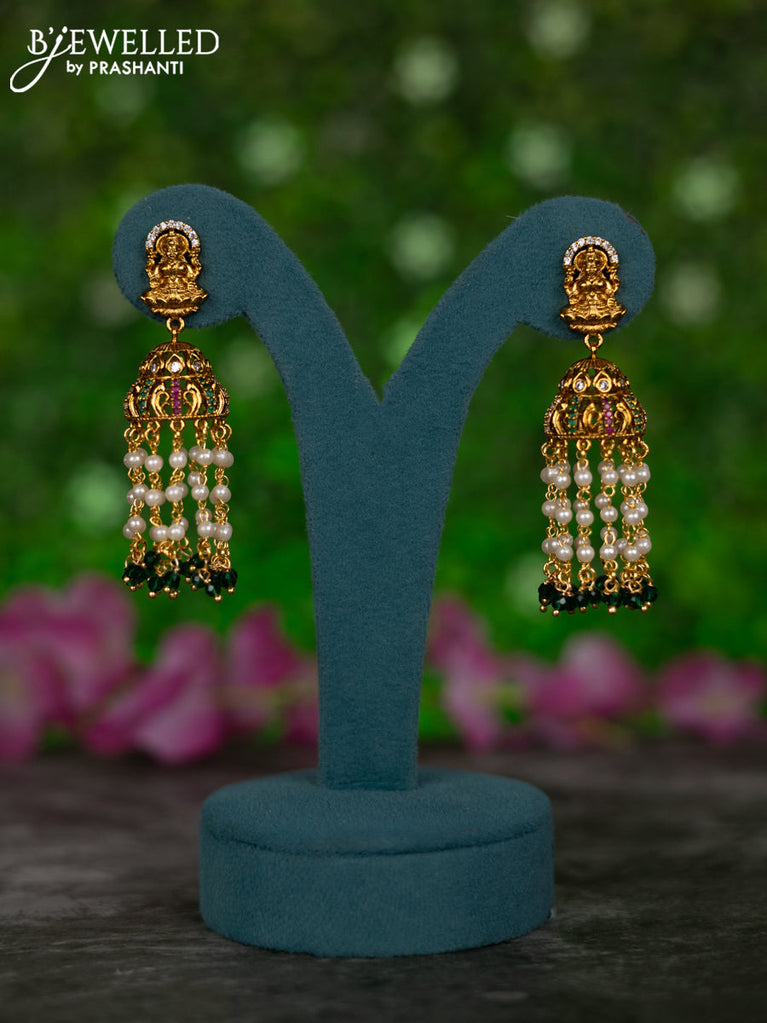 Antique jhumkas lakshmi design with kemp & cz stones and pearl & green beads hangings