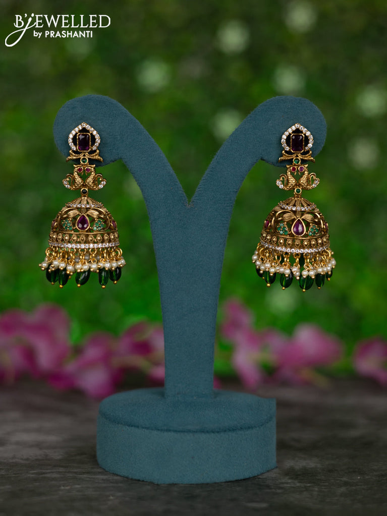 Antique jhumkas peacock design with kemp & cz stones and pearl & green beads hangings
