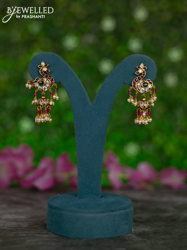 Antique jhumkas peacock design with kemp & cz stones and pearl hangings