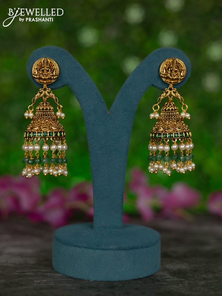 Antique jhumkas lakshmi design with green kemp & cz stones and pearl & green beads hangings