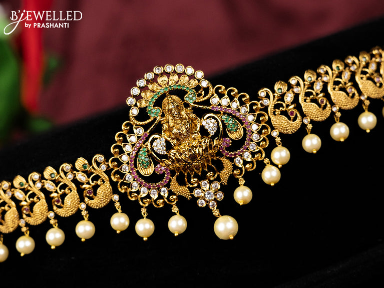 Antique hip chain lakshmi & peacock design with kemp & cz stones and pearl hangings