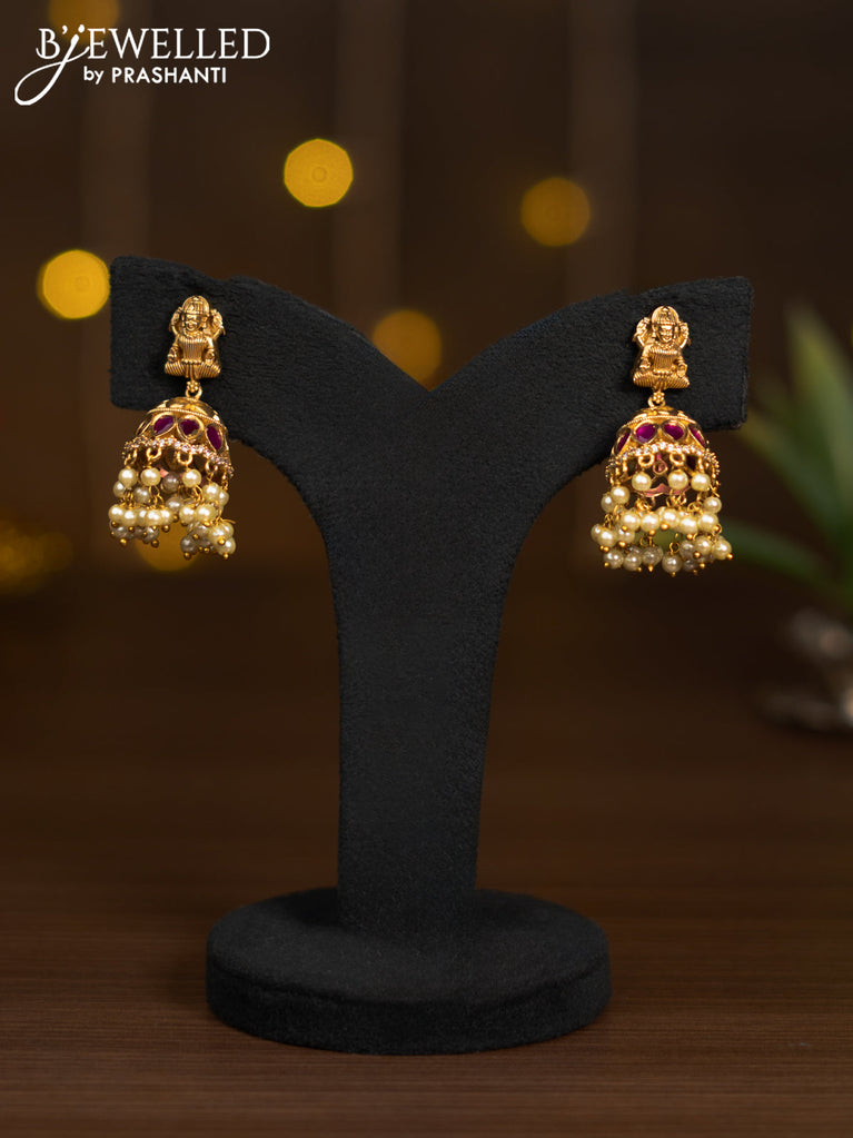 Antique jhumka lakshmi design with ruby & cz stones and pearl hangings