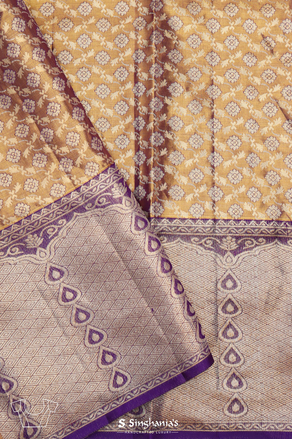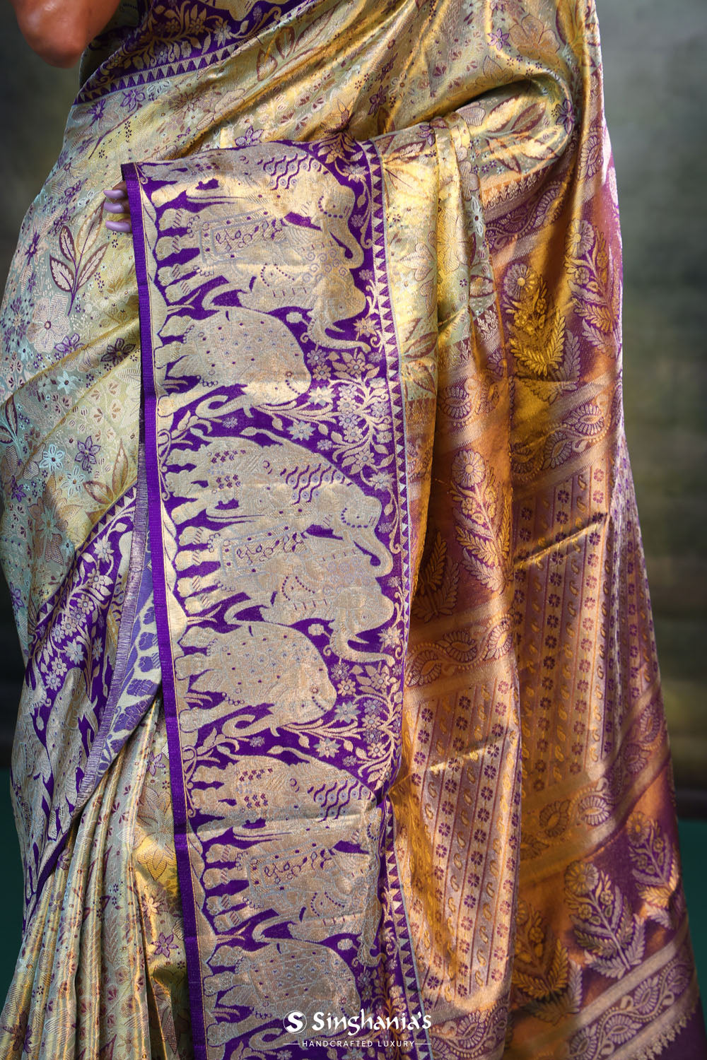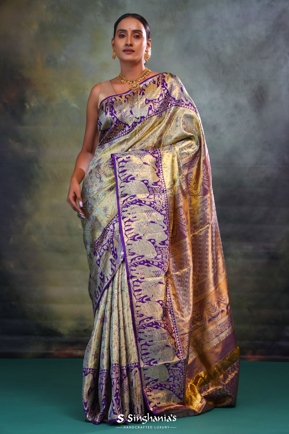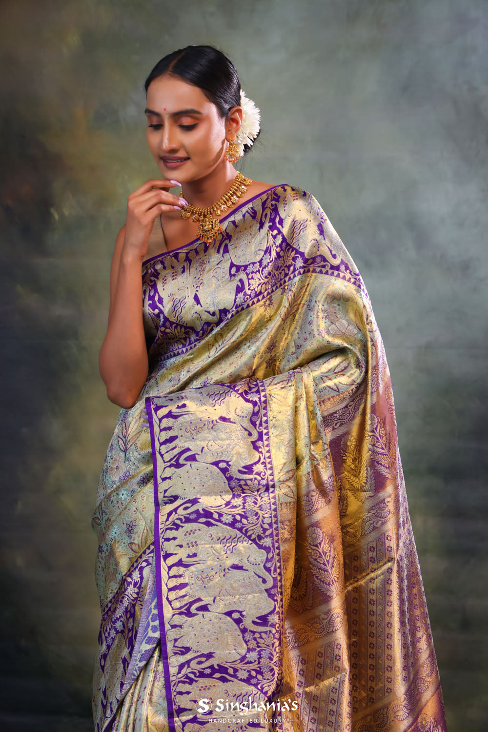 A beautiful kanjivaram silk saree in blue gold showcasing multi floral jaal in gold and tilfi zari all over the body. The big, contrasting border & pallu features traditional arrangement of floral-elephant motifs. A perfect choice for wedding receptions and festive occasions.