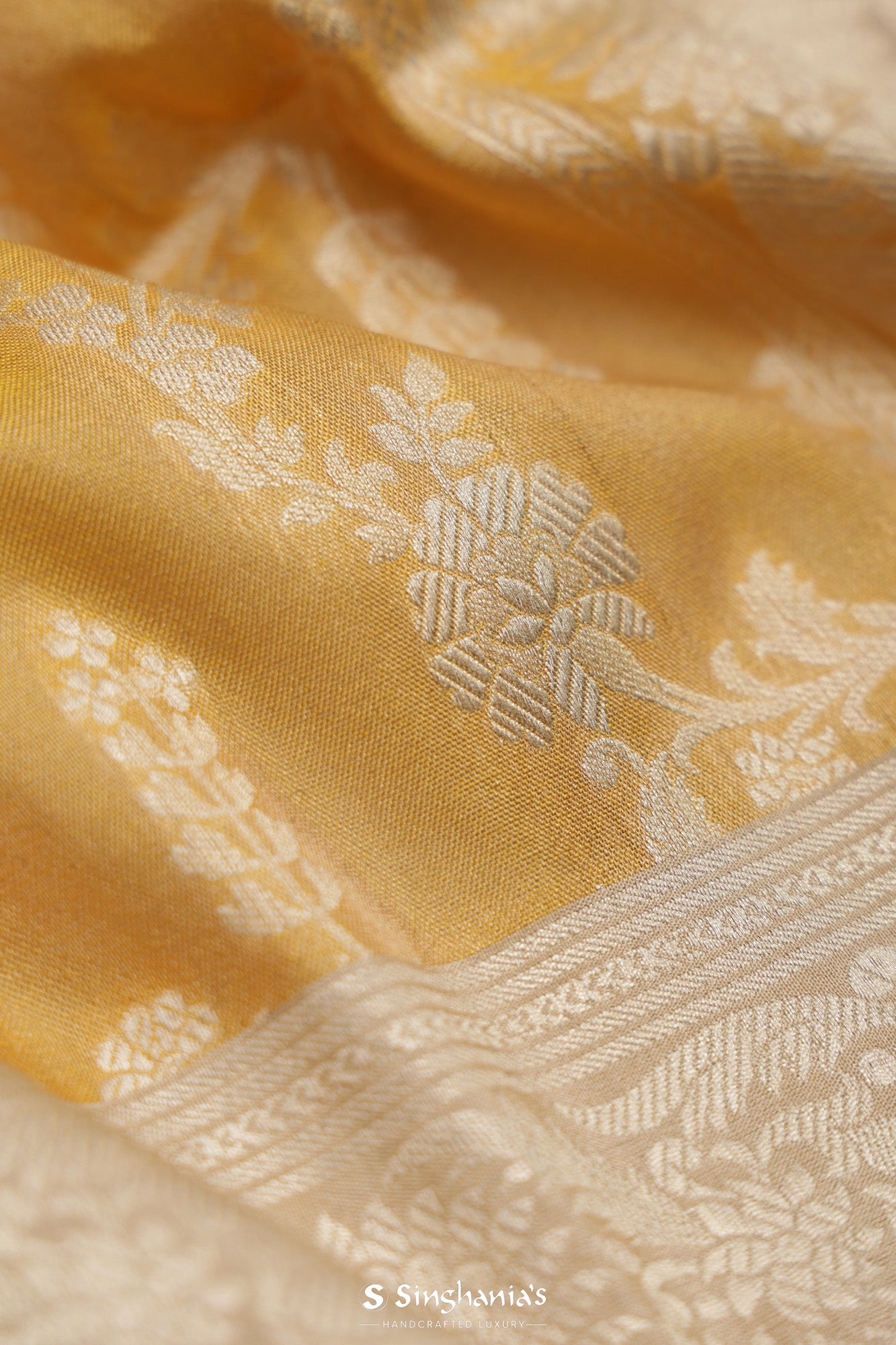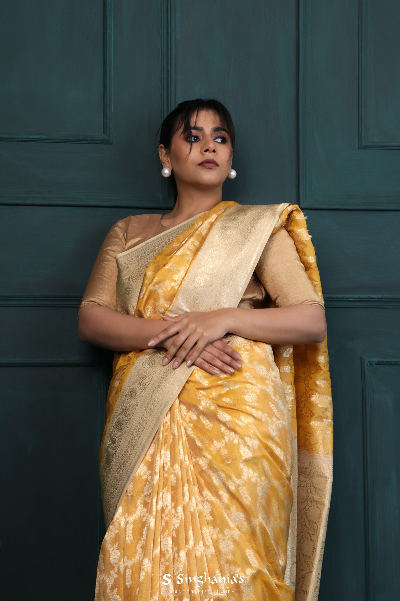 A stunning Traditional Gold Banarasi Silk Saree, crafted with a floral jaal design in gold zari weaving. Ideal for festive, mehndi/haldi and wedding parties, it features a small border with floral creeper pattern, adding to its festive charm.