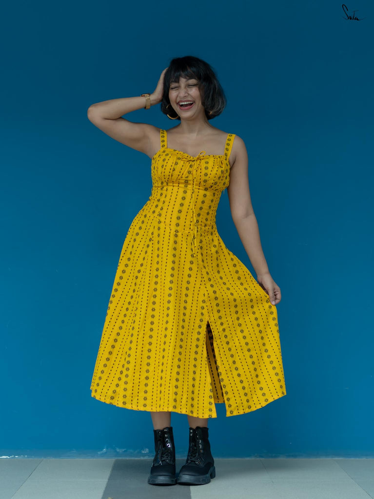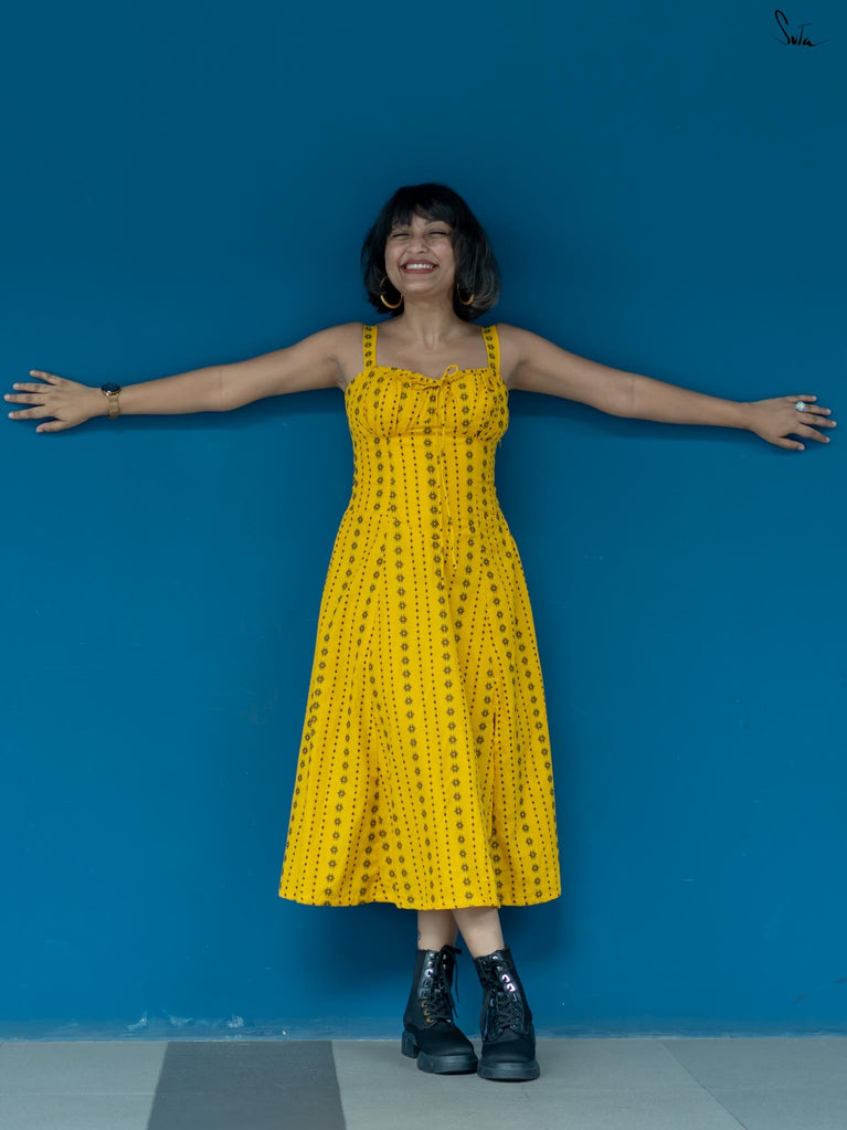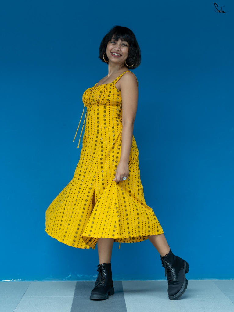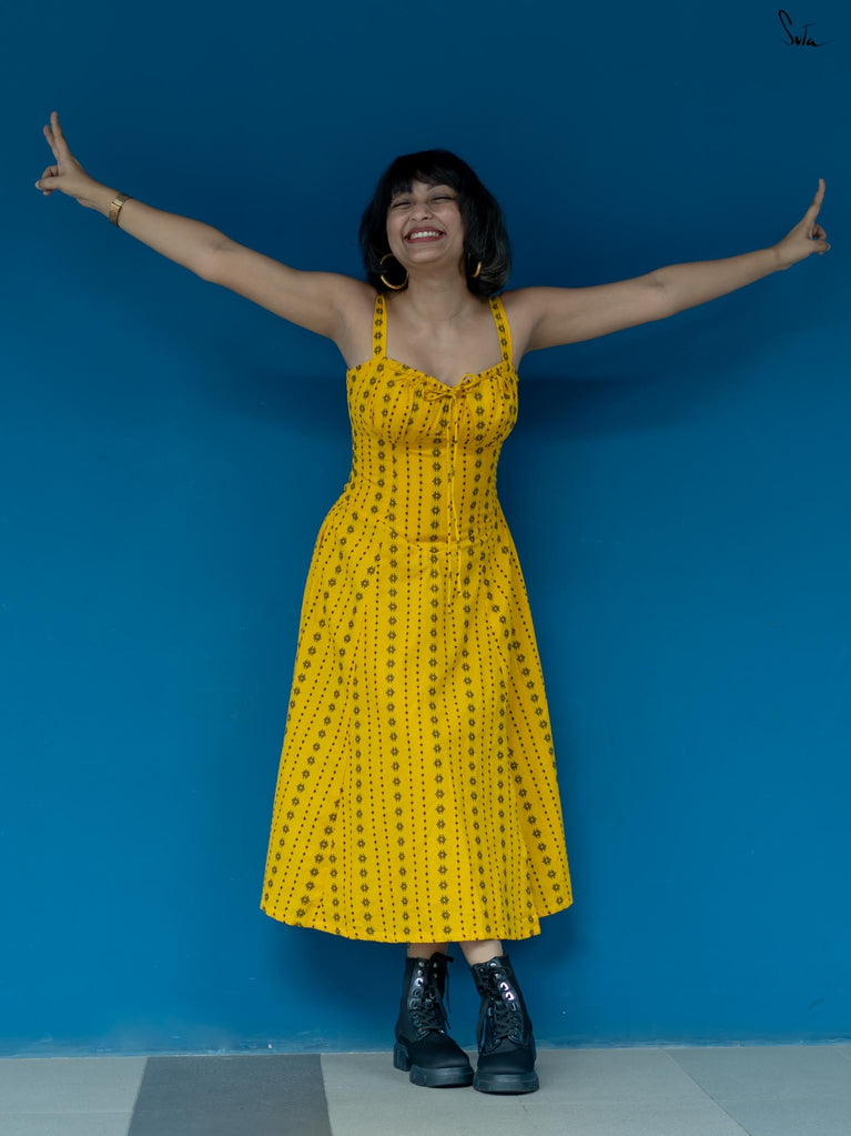 Taking inspiration from the endless hide-and-seek of the winter sunshine, the sleeveless yellow dress is as radiant as a ray of light. Woven from soft, delicate cotton fabric, the dress features a sweetheart neckline and a side zip. Embrace the beauty of 'Dhoop or Chao' and illuminate your surroundings with its warmth and energy.
