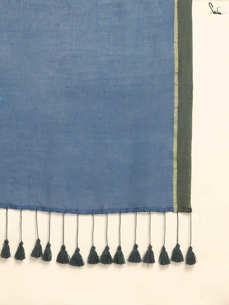 This is a blue classic saree-style pre-draped saree in mul cotton. It is the perfect partner to dress up or dress down, experiment and just be you¦all this in a matter of mere minutes!