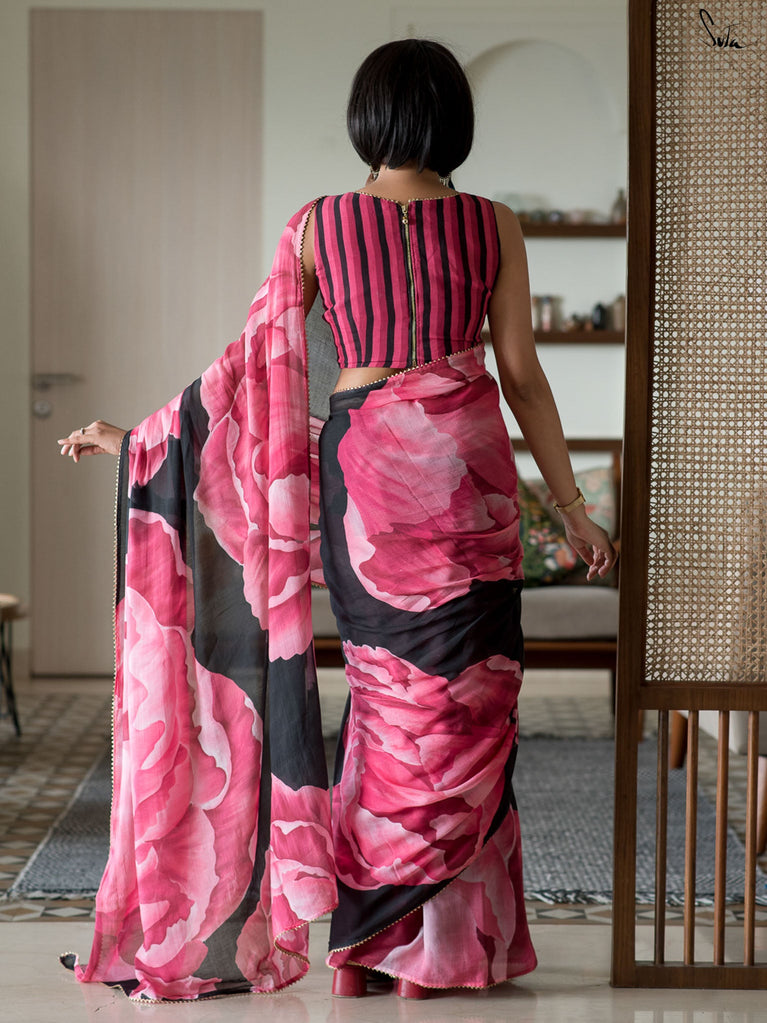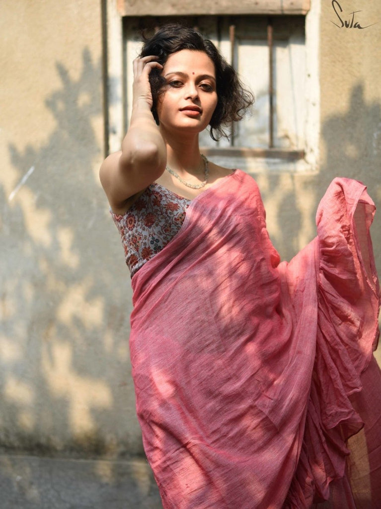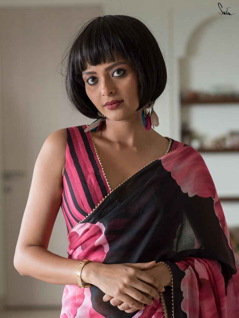 The model is wearing size S blouse and the saree is Dipped in Gulaal