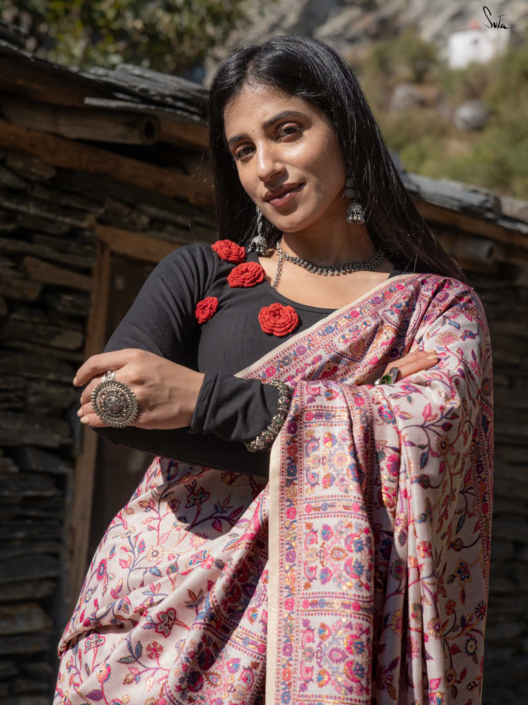 The model is wearing a size S blouse and the saree is Dipped in Gulaab.
