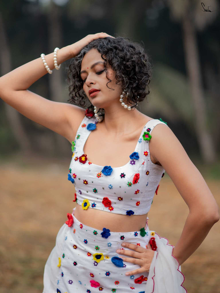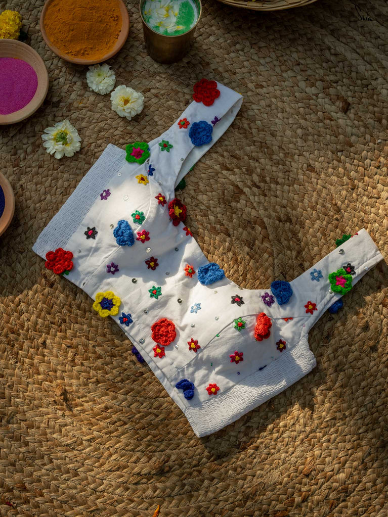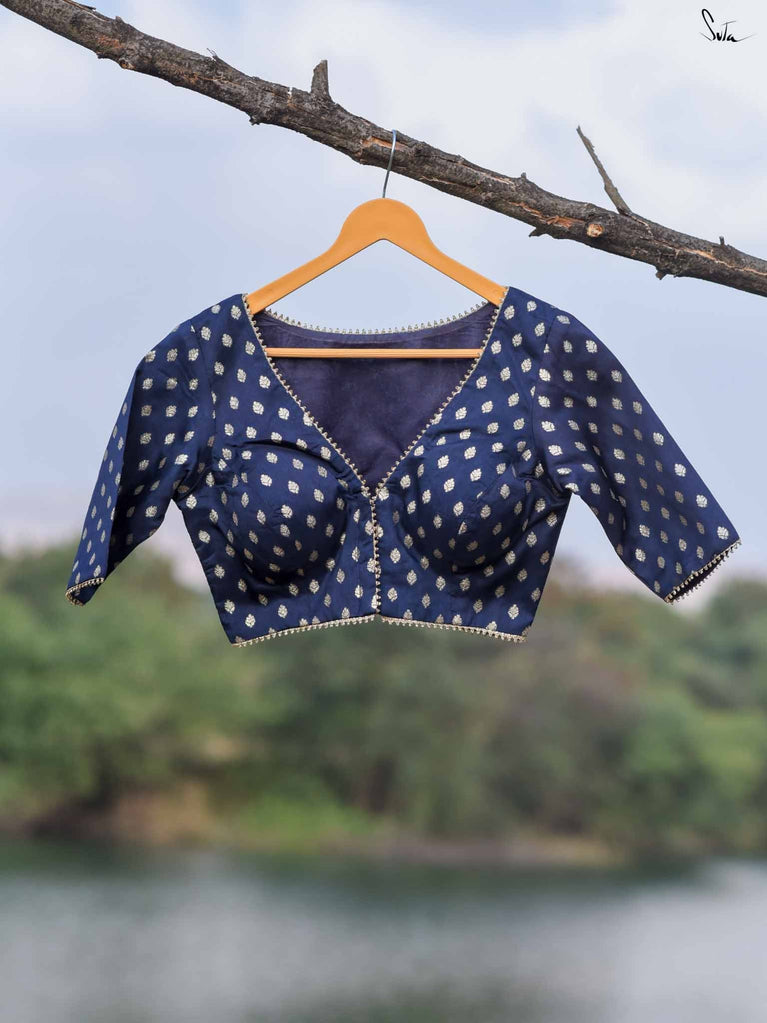 Timeless and graceful, this navy blue half-sleeved cotton blouse is your perfect partner for every Holi. The delicate French knot embroidery speaks of effortless charm, while the sleek U-neck and front hook opening make it as easy to wear as it is stunning. The Elas-Tech fit stretches to hug your body in a perfect fit, allowing you to move and revel in the festivities, wrapped in comfort and beauty. This blouse adapts to your movements, making you feel both stylish and at ease. For the ideal fit, we recommend shopping one size below, as it expands and molds to your body.