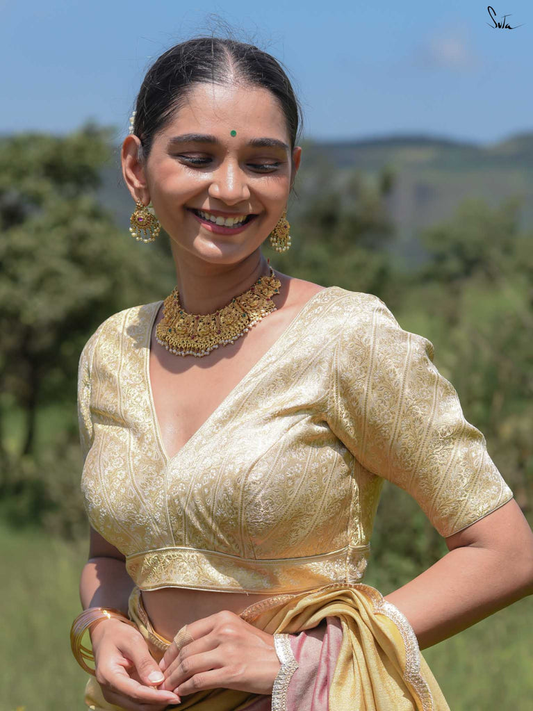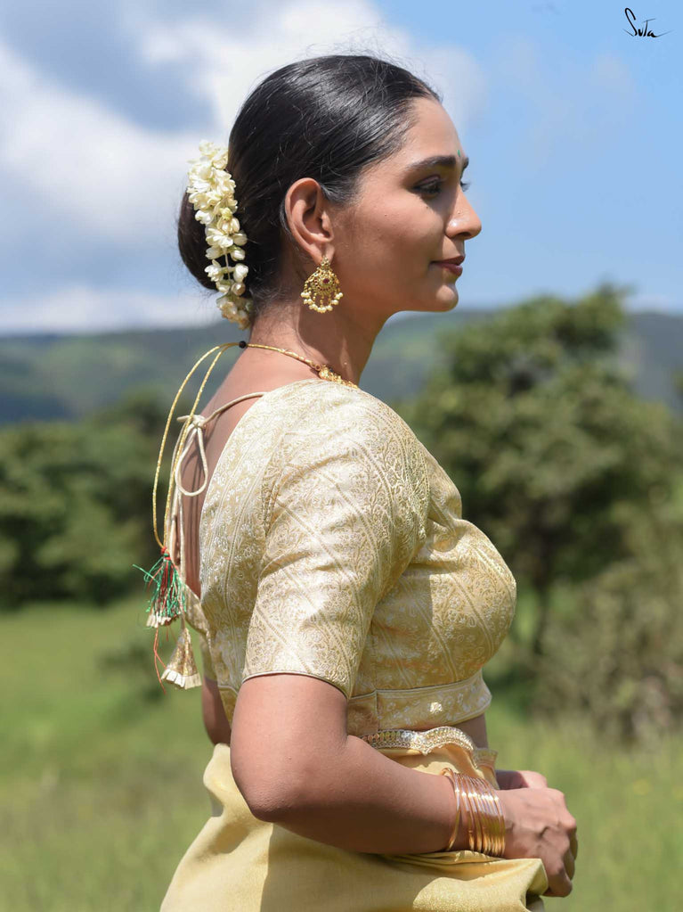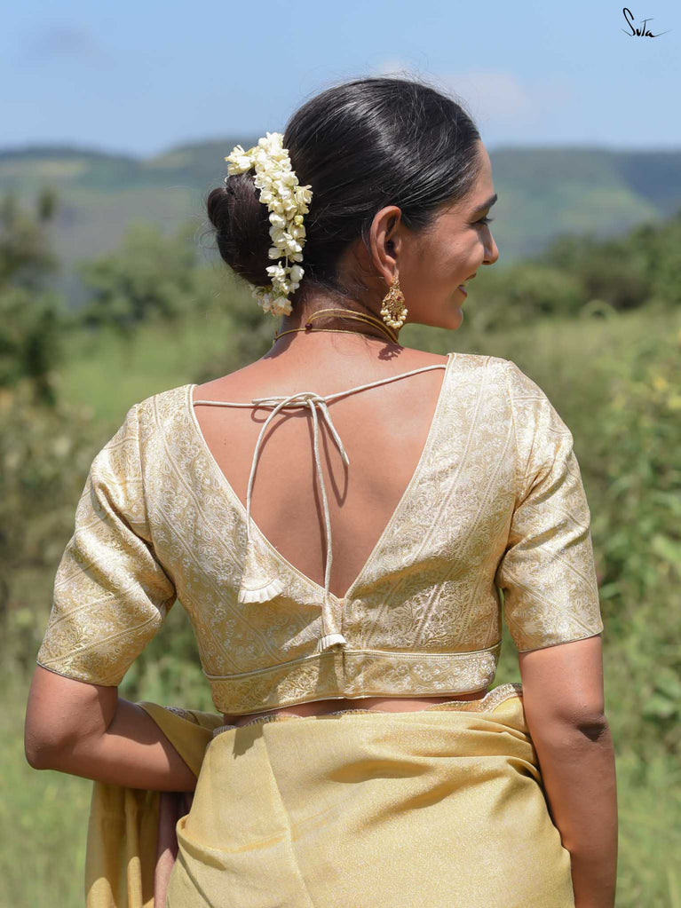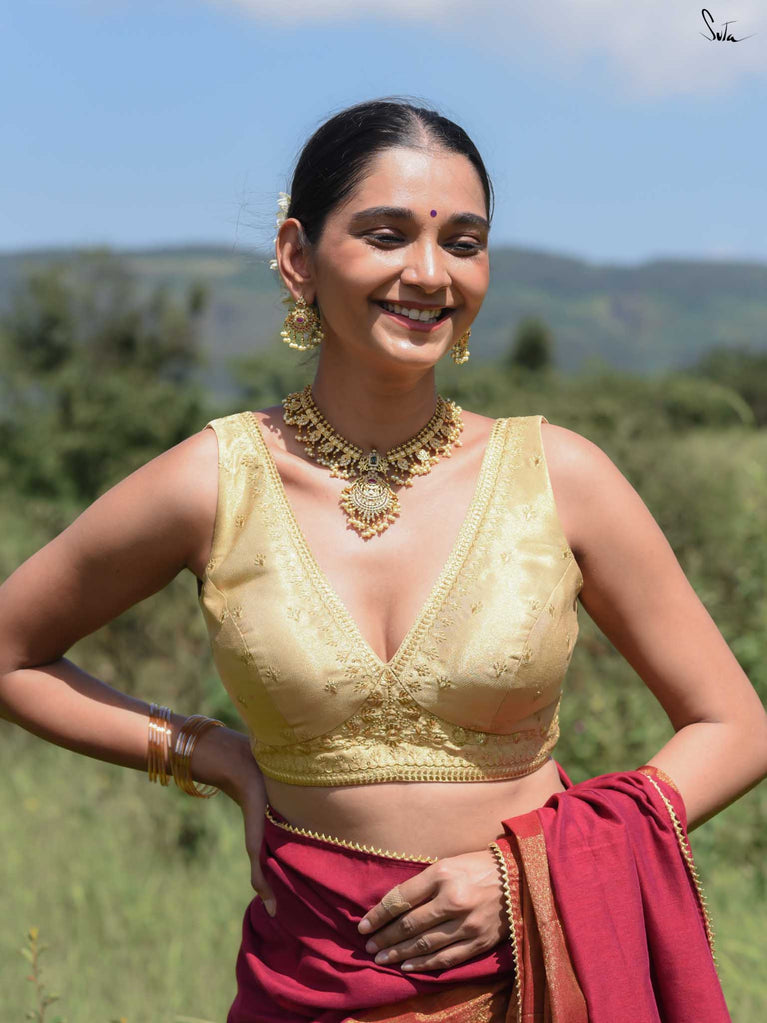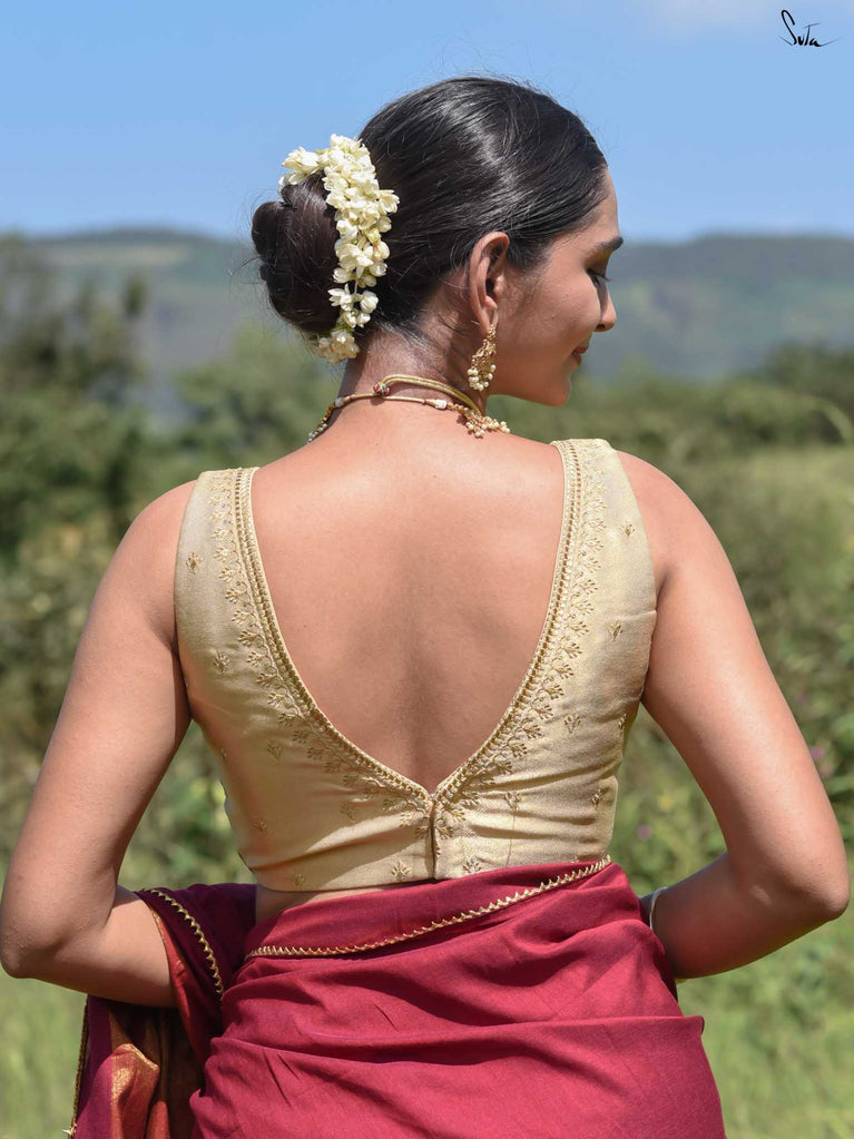 Shimmering, elegant, and festive, the Glitter Gold brings a radiant glow to any saree ensemble. Crafted with intricate machine zari floral embroidery, this sleeveless blouse features a flattering V-neckline and a back-open hook closure for a comfortable and stylish fit. Perfect for weddings, festive celebrations, or evening gatherings, it adds a touch of glamour and timeless charm to traditional attire.