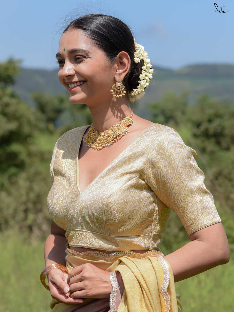 Elegant, radiant, and timeless, the Champagne Gold adds a subtle shimmer to any saree look. Crafted from luxurious brocade fabric, this blouse features intricate floral embroidery, a flattering V-neckline, and half sleeves for a classic appeal. The back-open design with hook closure ensures comfort while maintaining a graceful fit. Perfect for weddings, festive celebrations, or evening occasions, it’s a versatile addition to your festive wardrobe.