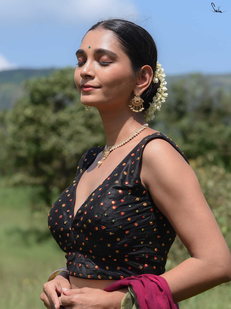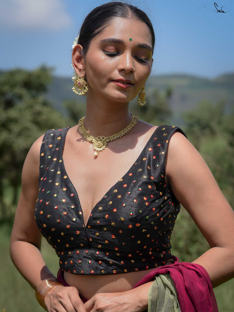 Chic, elegant, and effortlessly festive, the Carbon Gold is a striking addition to your saree wardrobe. Crafted with intricate machine embroidery in playful polka motifs, this sleeveless blouse features a sophisticated dome neckline and a back-open hook closure for a comfortable, flattering fit. Perfect for pairing with festive, wedding, or evening sarees, it brings a touch of glamour and modern charm to any celebration.