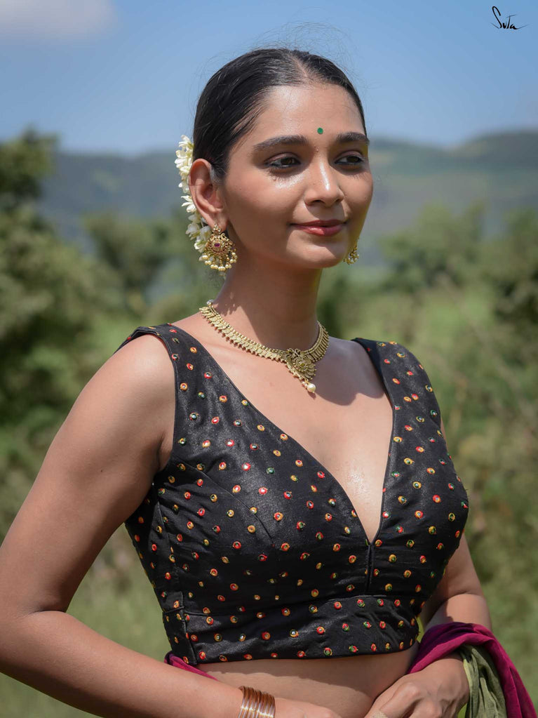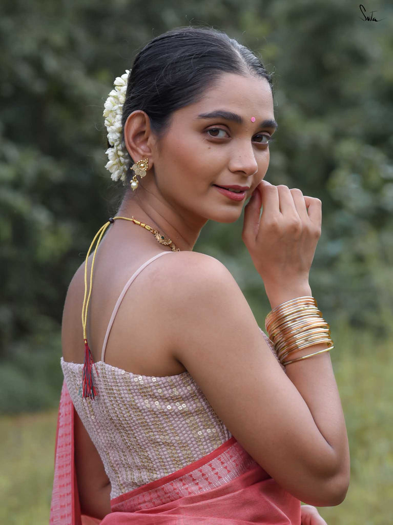 Brishti is one of our most skilled weavers. So many songs have been sung about rain, and we couldn’t think of a better way to honor her magic than in this blouse she made. This pink viscose-blend piece elevates any saree with its flattering V-neck and elbow-length sleeves. Padded and fitted with side elastic, it shapes beautifully while keeping you comfortable.