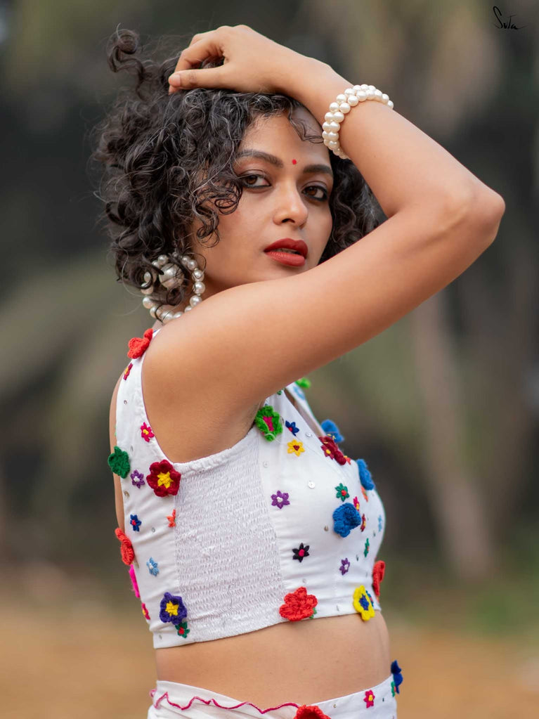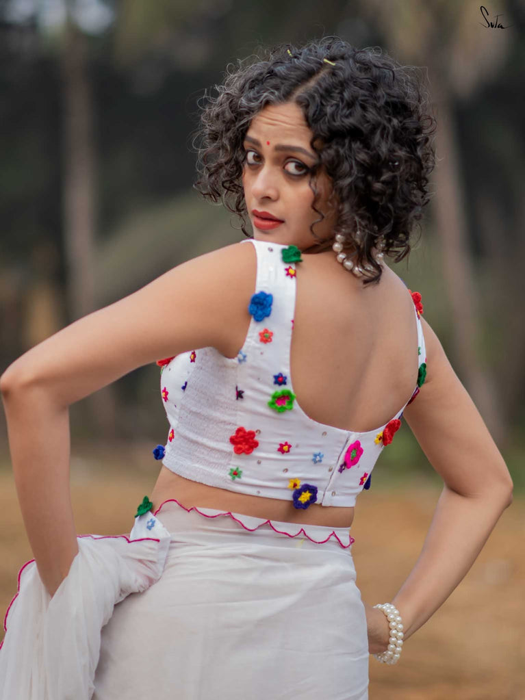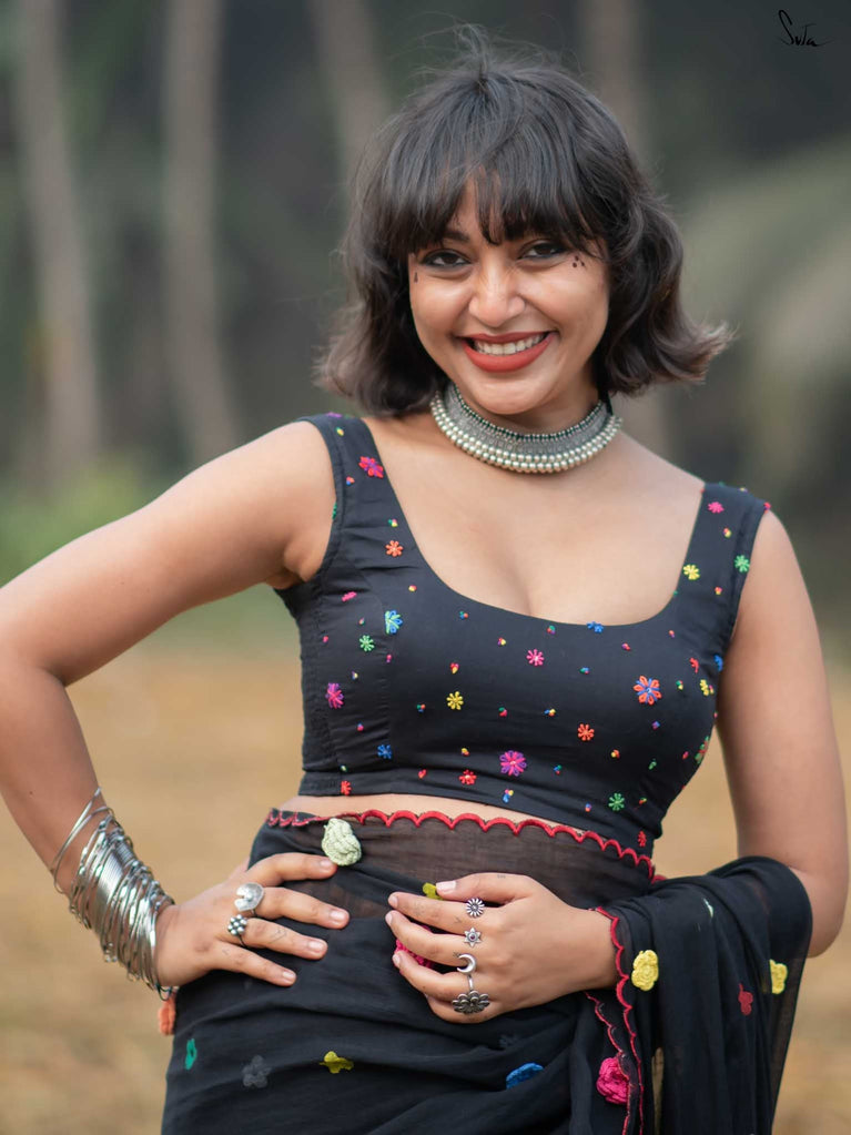 The model is wearing size S blouse and the saree is Dipped in Colours