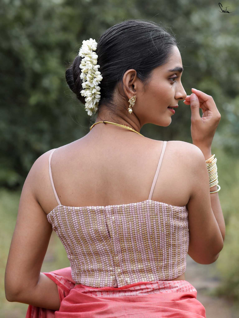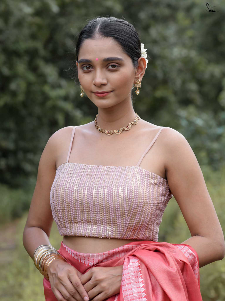 When the moment calls for a little sparkle, Full Chaandi answers. This baby pink blouse shimmers with delicate sequin embroidery that catches every flicker of light. The square neckline and dainty spaghetti straps lend it a modern, romantic charm that’s perfect for weddings, cocktails, or festive evenings under fairy lights. Light, luminous, and full of joy, it’s your cue to shine, head to toe.