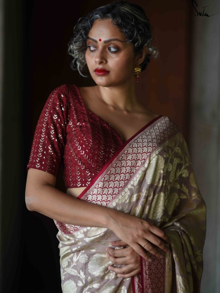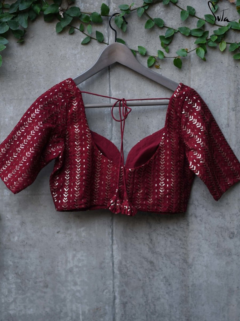 Be one with the cosmos, when you wear this stunning maroon statement blouse made of organza silk and featuring exquisite hand-embroidery.