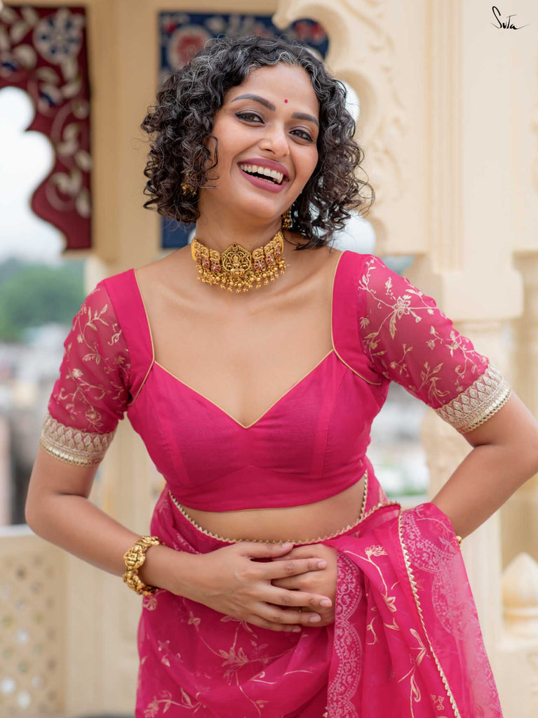 Add a sparkling pop to your festive or wedding look with Bubblegum Twist, a half-sleeve blouse in playful pink foil organza. Featuring a V-neckline and delicate golden floral foil prints with intricate lace detailing, it’s perfect for bridesmaids or festive celebrations.