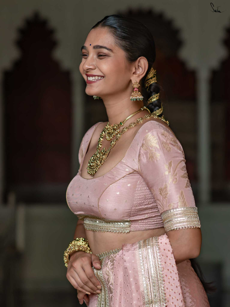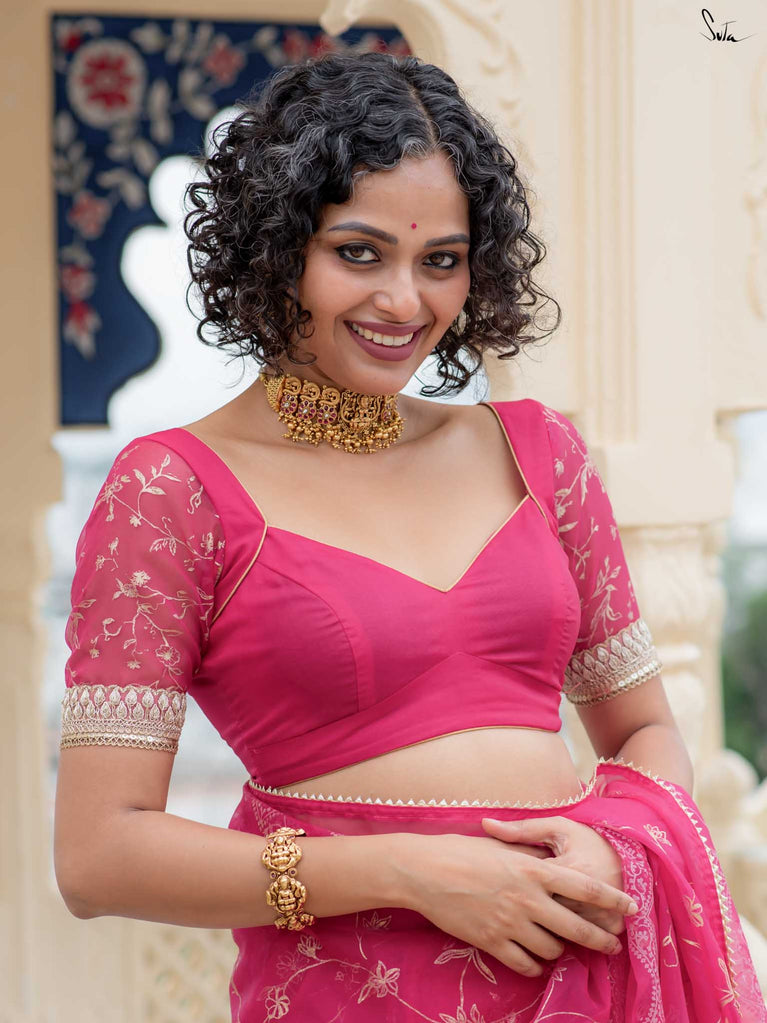 Designed with sheer sleeves, light padding, and a back hook-and-knot closure, this blouse pairs beautifully with matching sarees, adding twirl-worthy glamour and elegant charm to every occasion.