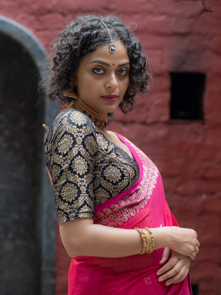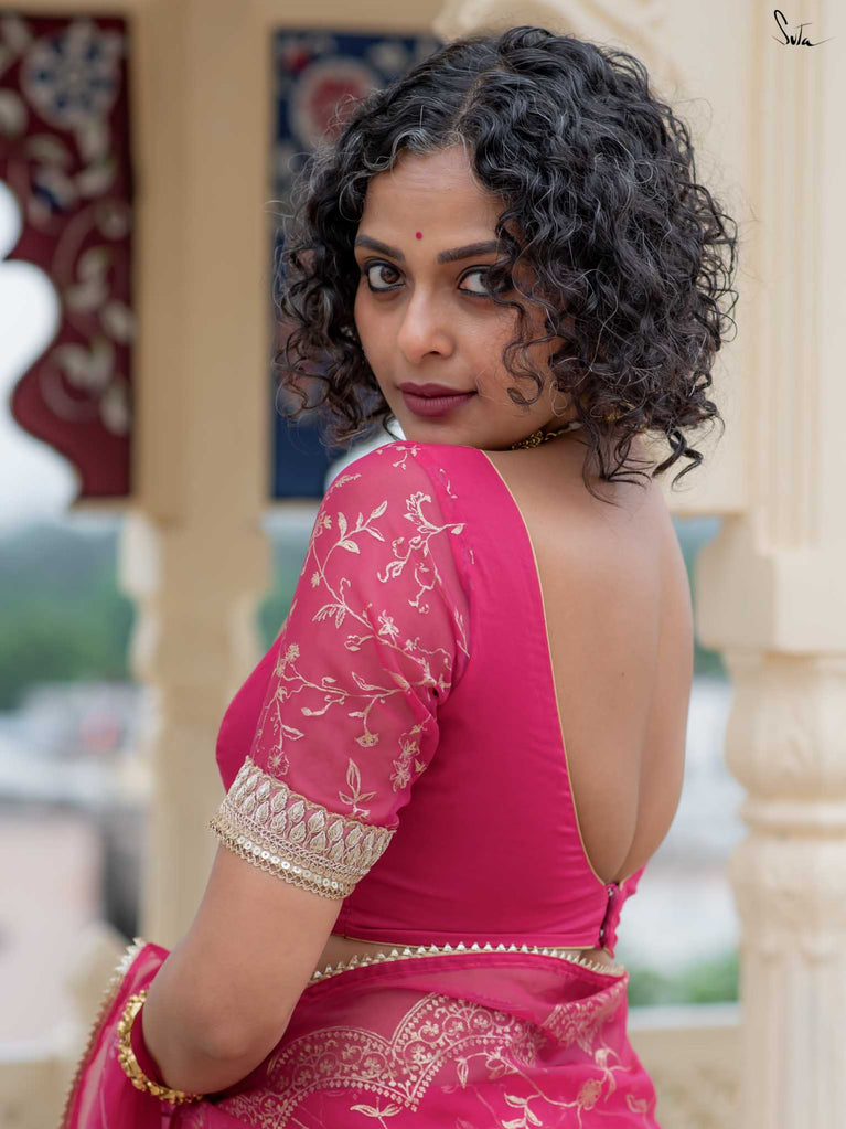 The model is wearing size S blouse and the saree is Gulabi Foil