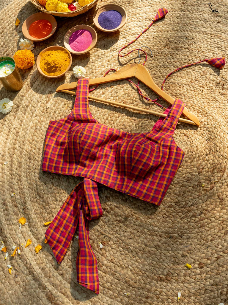 Playful yet polished, this multicolored checkered sleeveless blouse is a cheerful nod to the carefree spirit of Holi. With a chic back knot opening it fits like a glove, giving you comfort and confidence as you dance through the colors of the season. The cotton design ensures a perfect fit that provides comfort without compromising style.