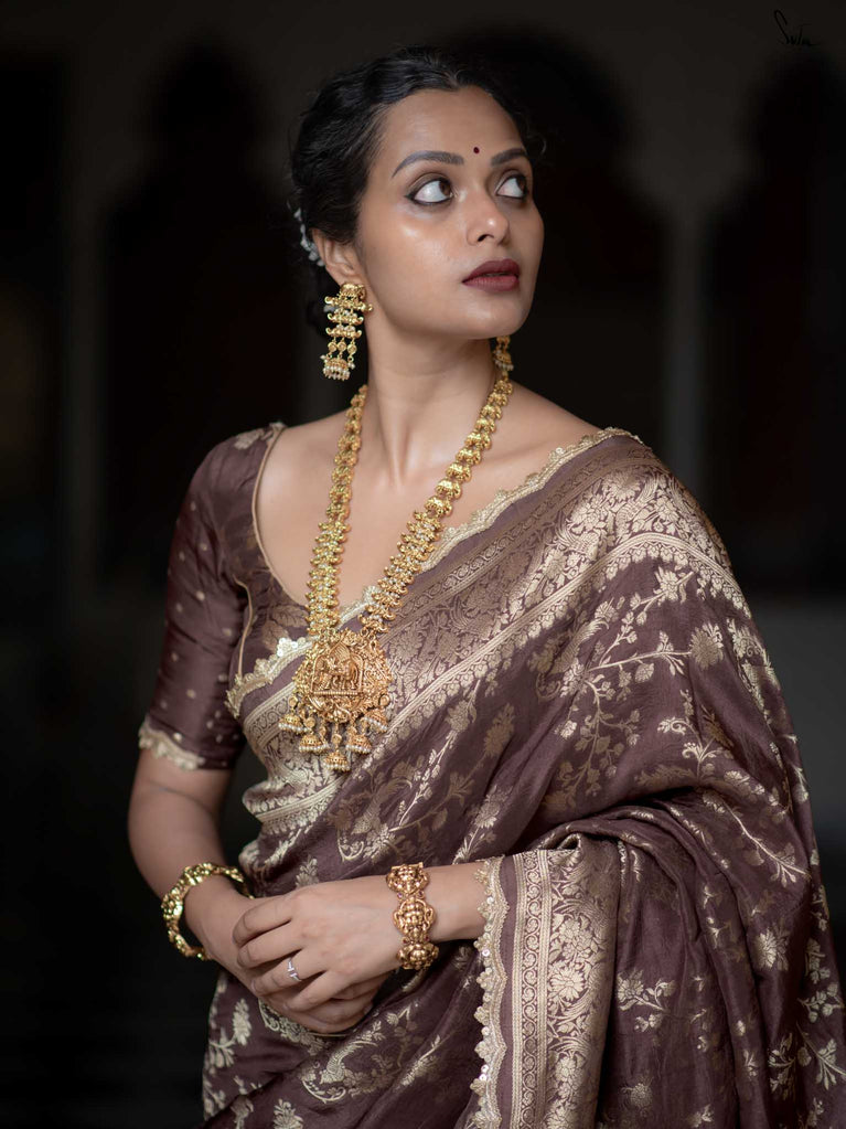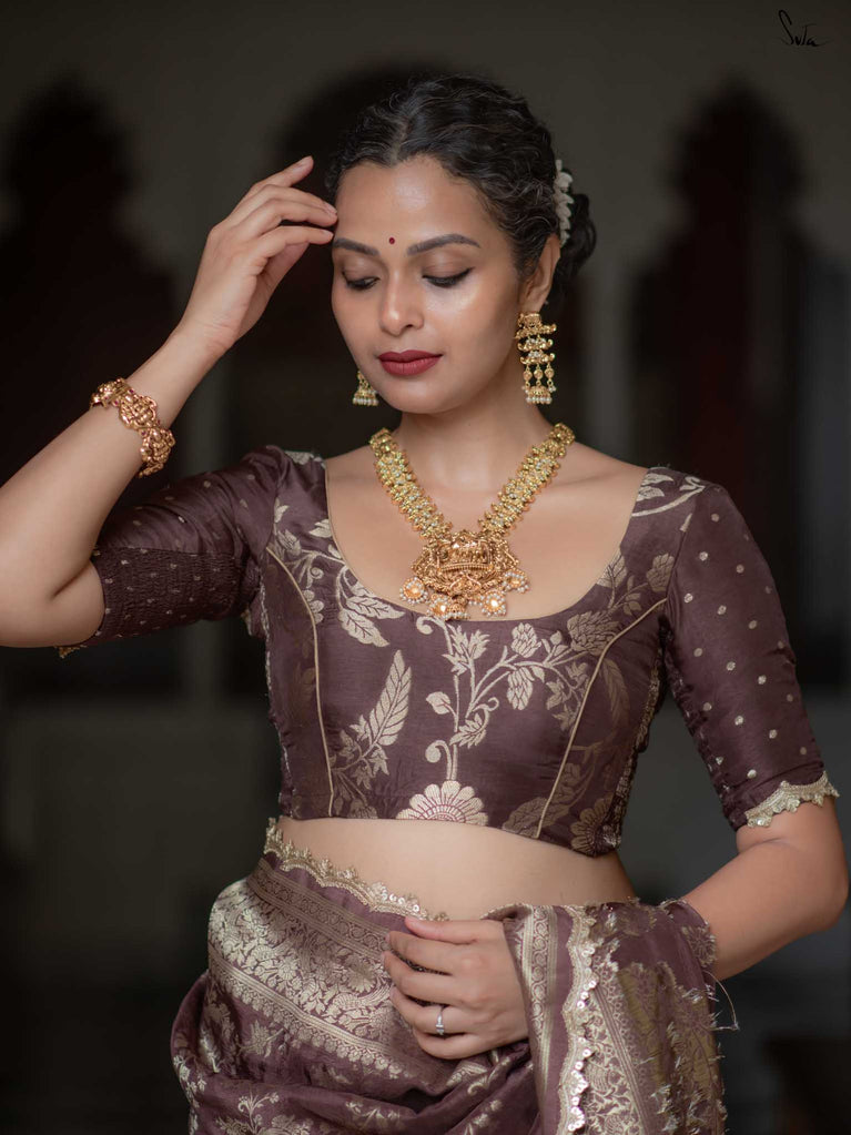 Elevate your festive and wedding look with Caramel Twist, an elegant half-sleeve blouse in rich brown foil organza. Adorned with delicate golden floral foil prints and intricate lace detailing, it exudes understated glamour with every twirl.