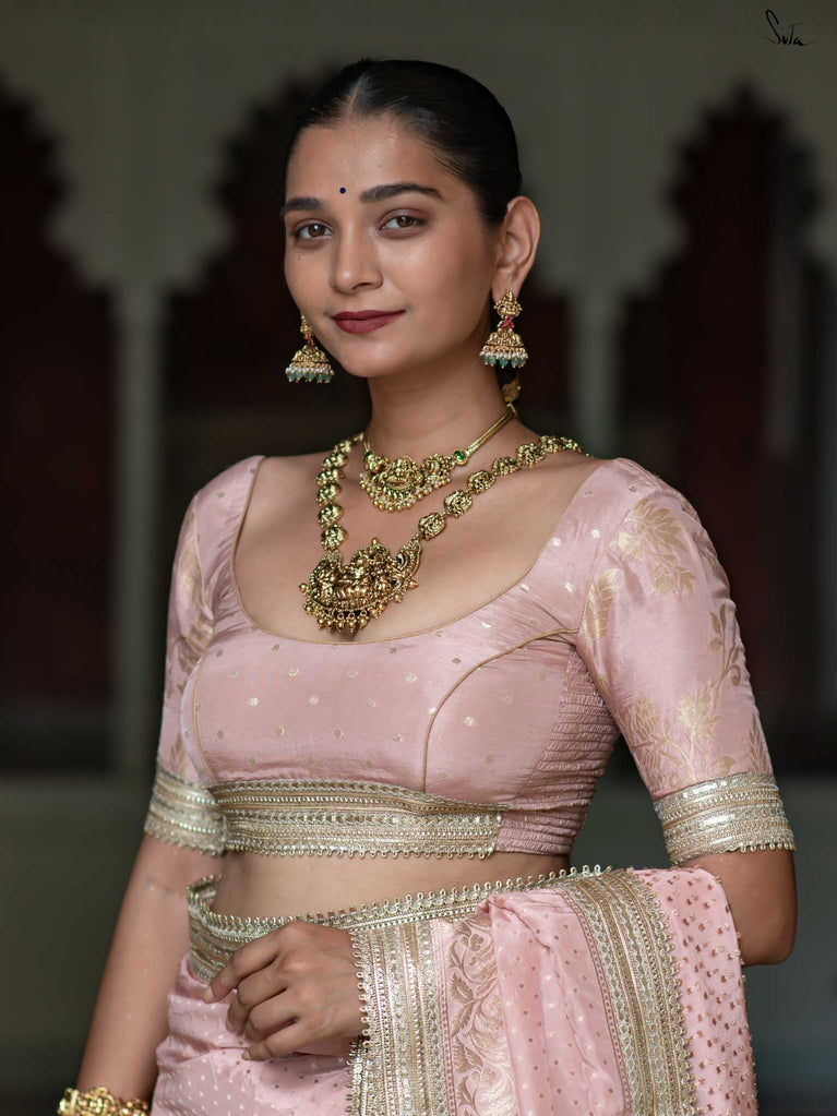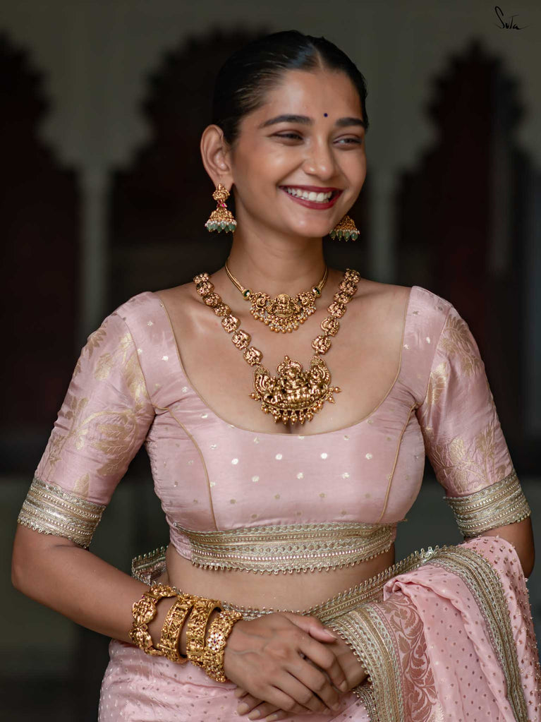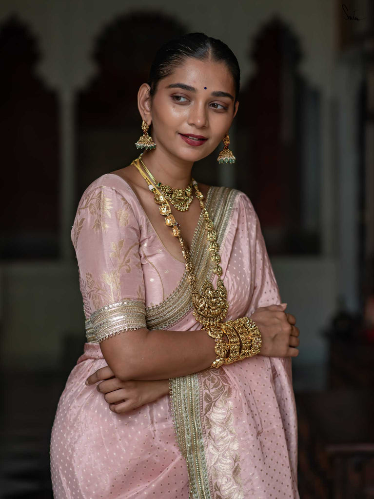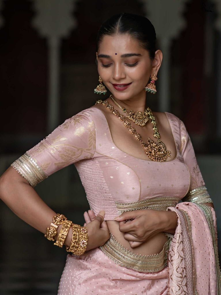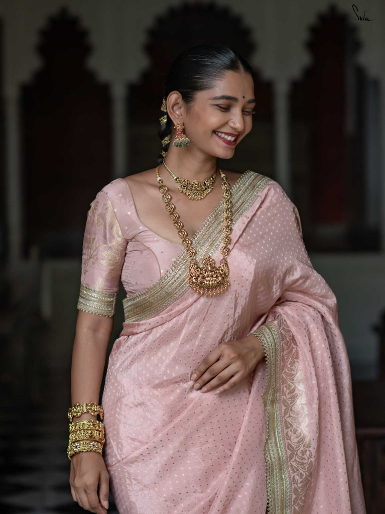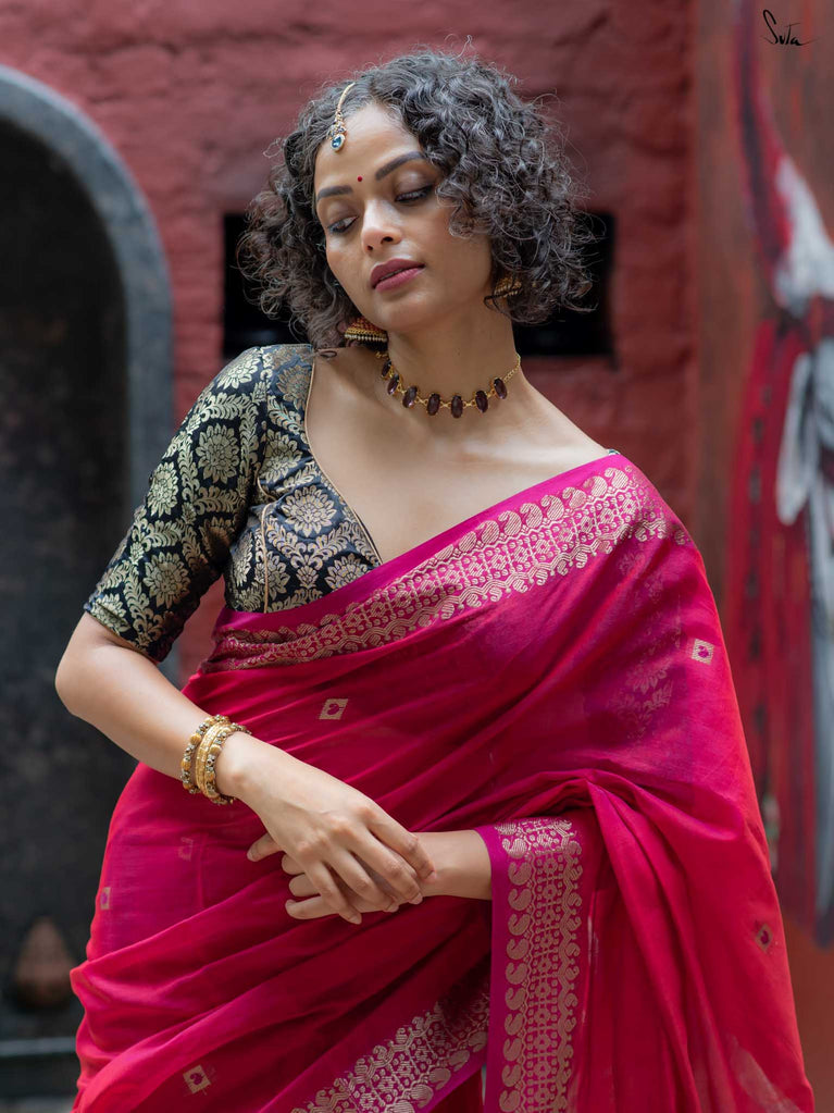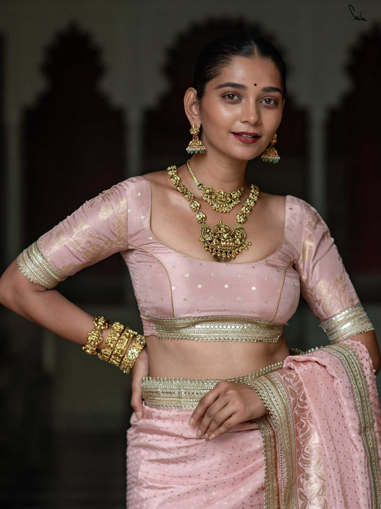 Rich in maroon and full of festive drama, Boondi Hai features a round neck, three-fourth sleeves, and embroidered lace on a woven polka and floral jaal base. The back round neck opening completes its classic look, making it a versatile choice for wedding sarees.