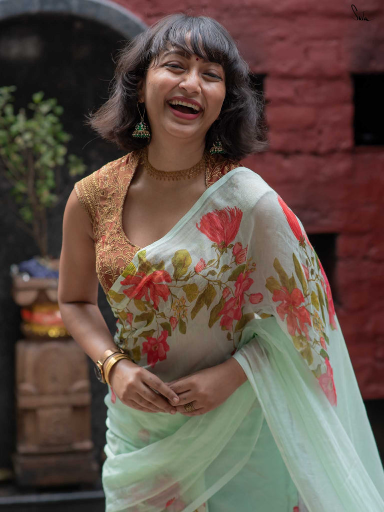 Named after Debjani’s endearing charm, this wine art silk blouse made by her is a must have. The dome neck and sleeveless cut flatter your shoulders, while the floral embroidered buttis add a delicate, artisanal touch. Padded and crafted with side elastic, it fits beautifully.