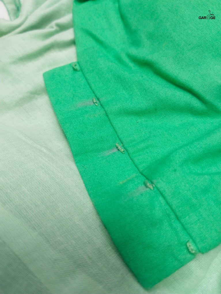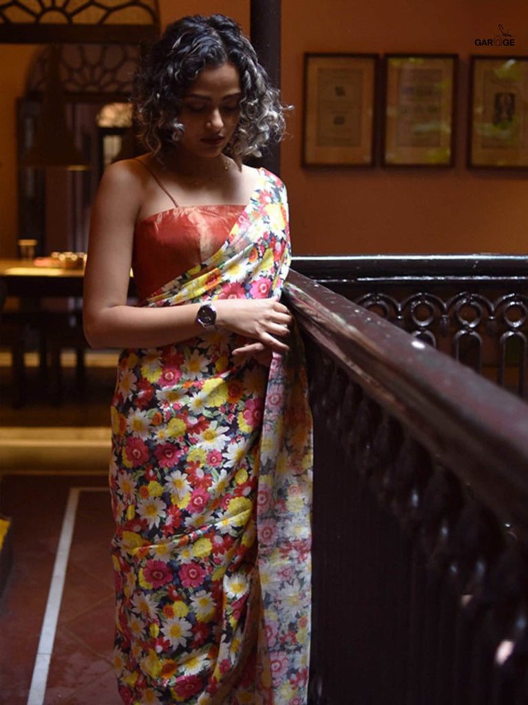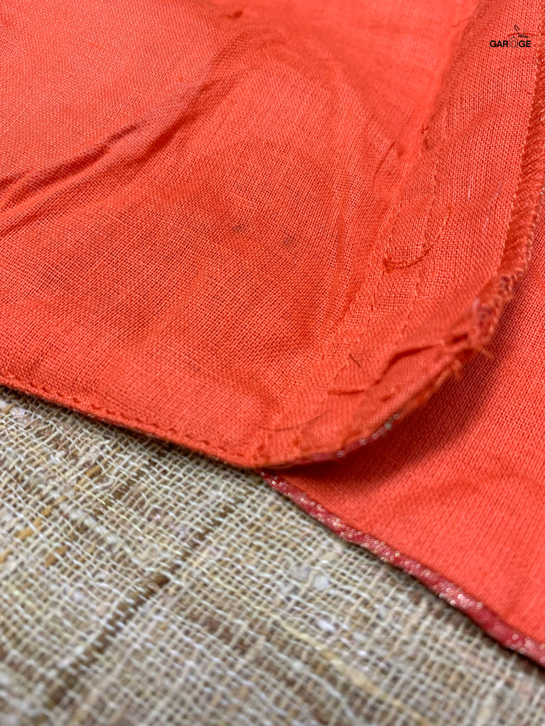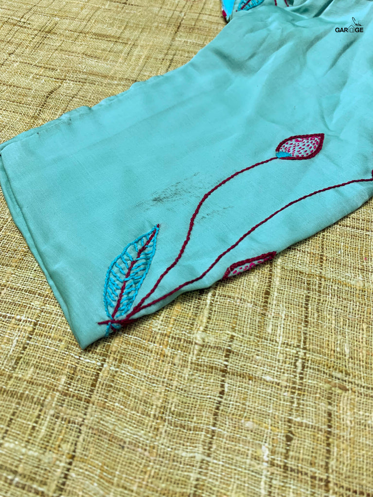 Cotton fabric dates back to some of the most ancient civilisations and it has a strong presence in the modern wardrobe as well. The incredible softness and lightness of cotton combined with its strength and versatility makes it one of the most popular choices, especially for the Indian climate. The comfort and the amazing feel that cotton offers in unparalleled! The fabric used for this blouse is a machine-embroidered cotton fabric which is also known as Hakoba cotton.The ruffle detailing on the blouse is made of organza fabric.Organza is a type of weave that creates light-weight, breathable, dreamy, translucent fabric that brings a certain ethereal charm to apparel. This weave also renders a characteristic stiffness, which beautifully comes together with the overall fluidity of the fabric. Organza can be made with different types of fibres. For this blouse, the organza weave is made of polyester.