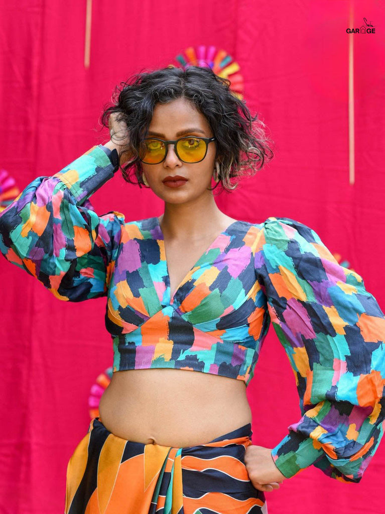 Su, the model is wearing size S blouse and the saree is In my Desert Planet Polka.