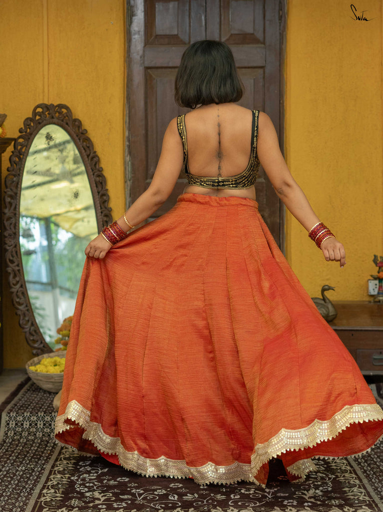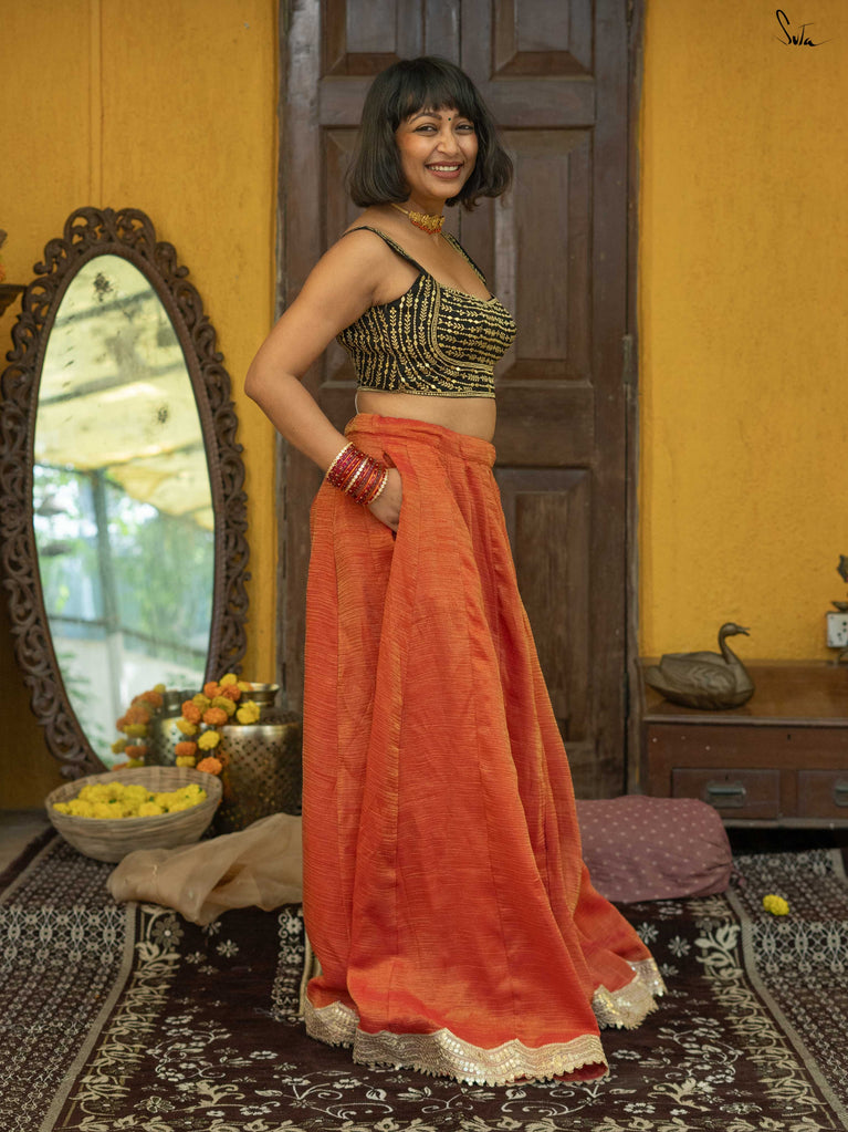A classic red that feels joyful, timeless, and full of celebration. This crushed viscose lehenga is made for wedding days that feel extra special—rooted in tradition but easy on the body. Light, fluid, and softly festive, it moves with you through rituals, blessings, and all the dancing in between. Scalloped gold lace adds a warm glow, while tassels bring a playful finish. Style it with a blouse for a traditional look, drape it with a saree, or wear it as a skirt with your favourite crop top. Because when it’s nani ki shaadi, joy takes centre stage.