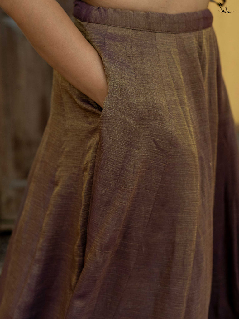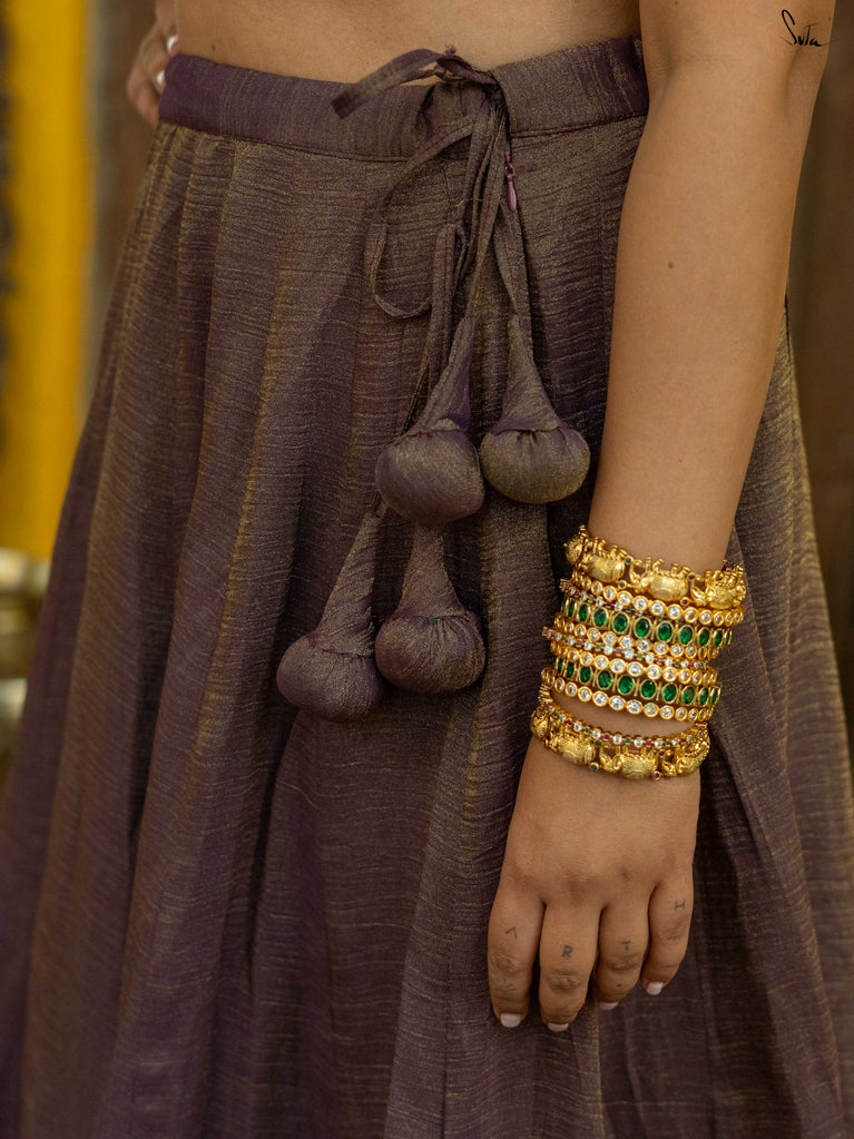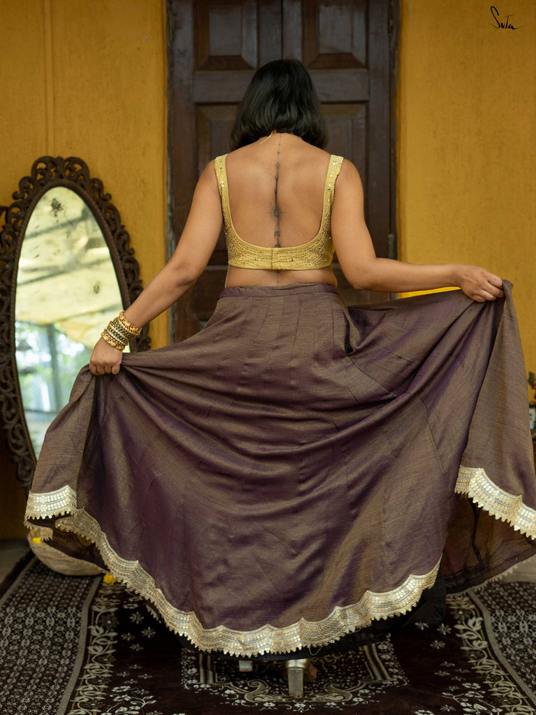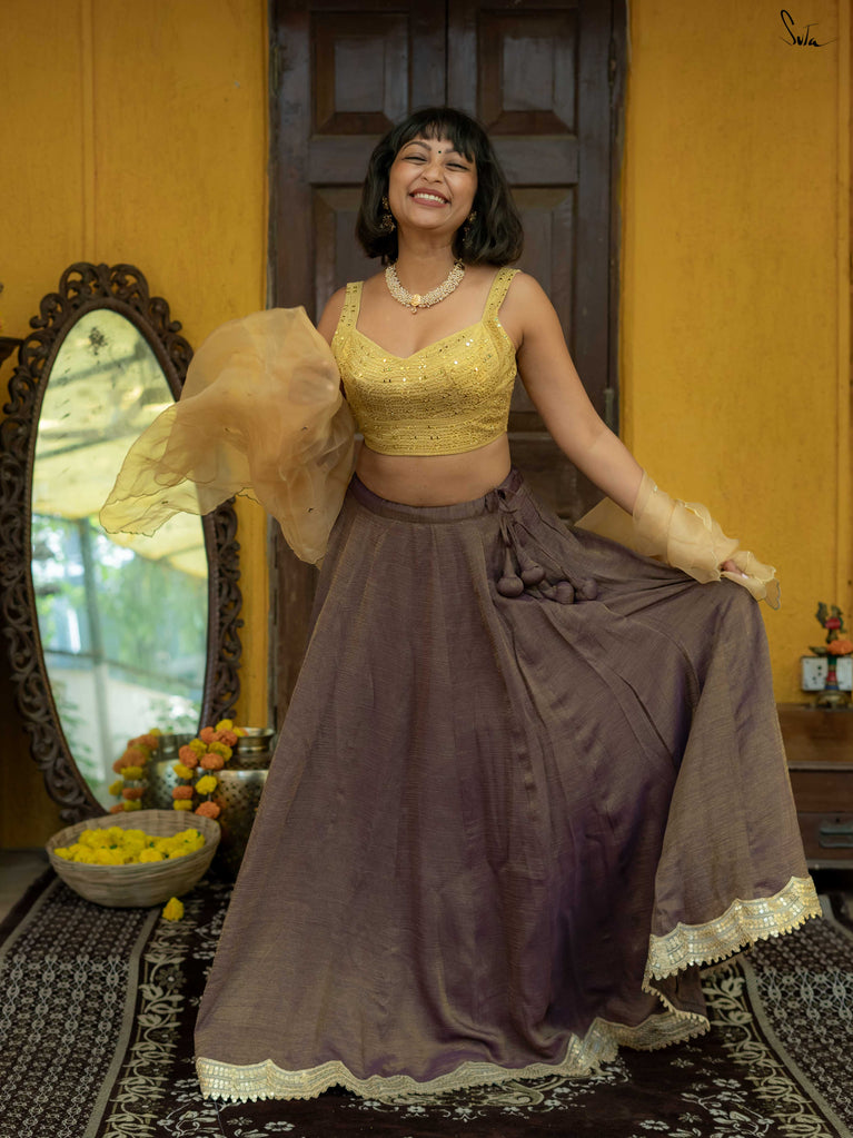 A soft mauve that feels calm, celebratory, and just dressed up enough. This crushed viscose lehenga is made for long wedding days that flow from rituals to laughter to dancing without pause. Light on the body with a gentle festive sheen, it moves beautifully and sits easily, so you can enjoy every moment without feeling weighed down. Scalloped gold lace adds a hint of glow, while tassels bring a playful finish.Style it your way, pair it with a blouse, drape it with a saree, or wear it as a skirt with your favourite crop top. Because when it’s didi ki shaadi, you deserve to feel free and festive at the same time.