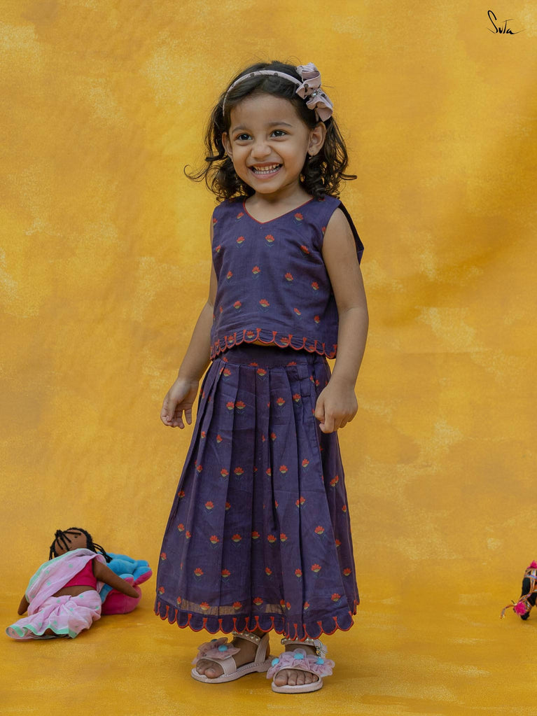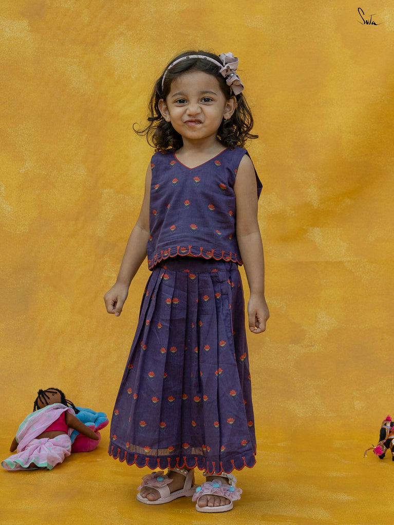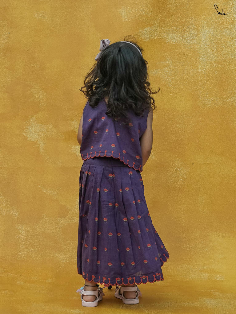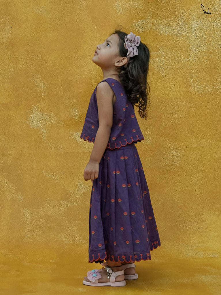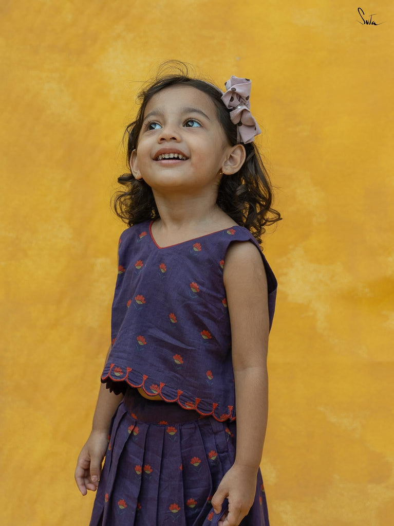 Adorn Chubby Cheeks like your delightful expressions while your child awestruck you with cuteness. The lehenga set in a rich purple floral print is beautifully crafted in cotton with scallop detailing. The outfit celebrates the joy of childhood, allowing your little one to twirl in style.