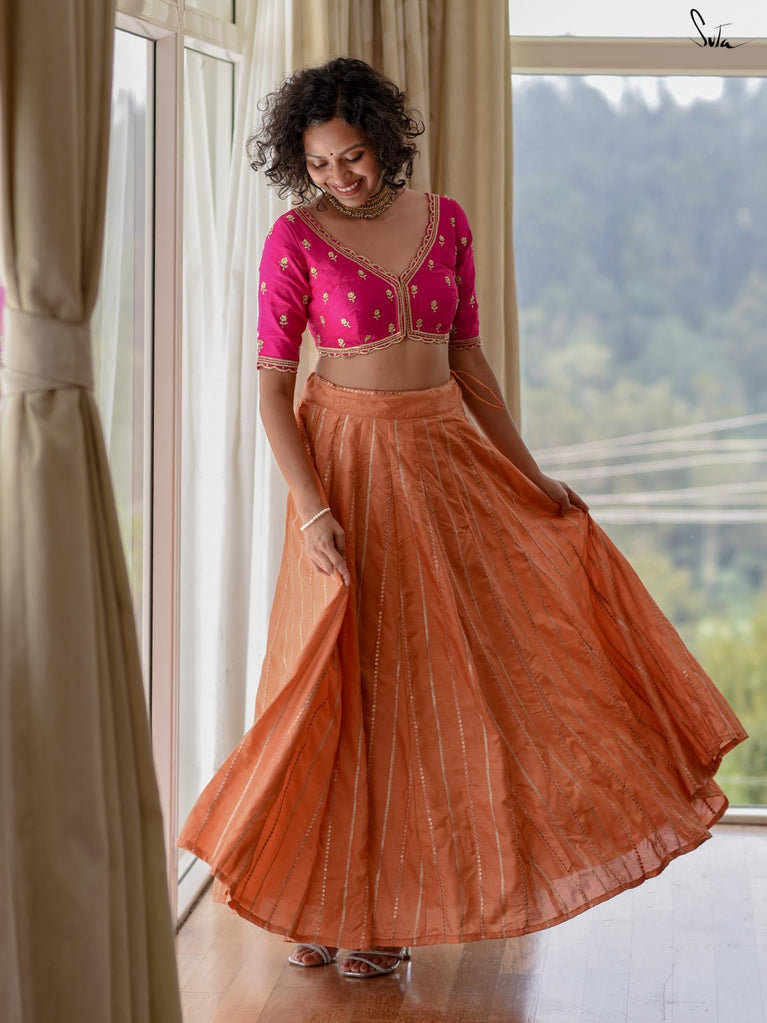 It was 5 am on a cold winter’s morning and Niharika was already wide awake. It was the first day of her wedding festivities. She was only hours away from being swept away by the hustle and bustle. But for now, her world was tranquil and calm. Her soulmate was her childhood sweetheart, with whom she had gone through many ups and downs. While she was happy, she could not help the nostalgia that washed over her, as she gazed out at the lawn, the big dahlias and the vibrant the rose bushes she had grown up amidst. In the horizon, dew drops sparkled on the leaves of the trees surrounding their house. And, as she stood there, the inevitability of change dawned on her. Today her life would change forever, but, for now, she would reminisce about the life she was leaving behind.Capture your most beautiful memories in this gorgeous art silk lehenga.