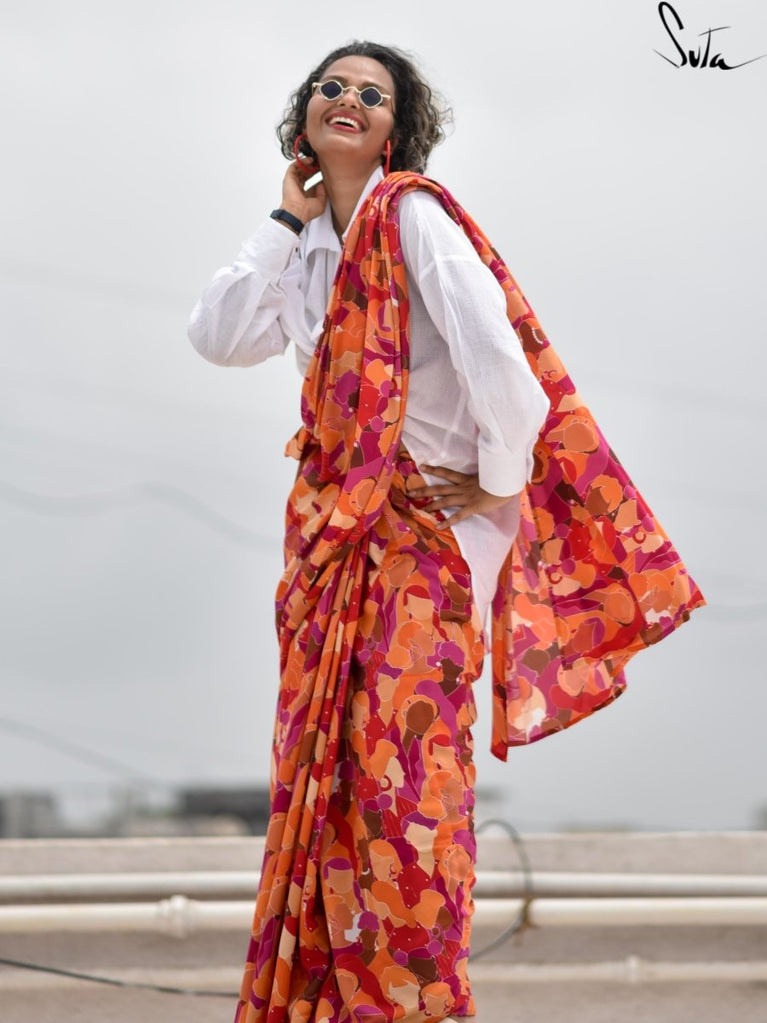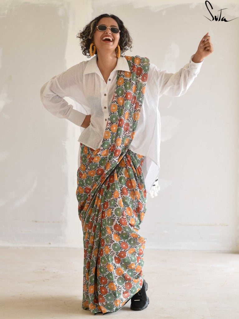 Saree: Su, the model is wearing a size S blouse and the saree called Palash Sa Basant