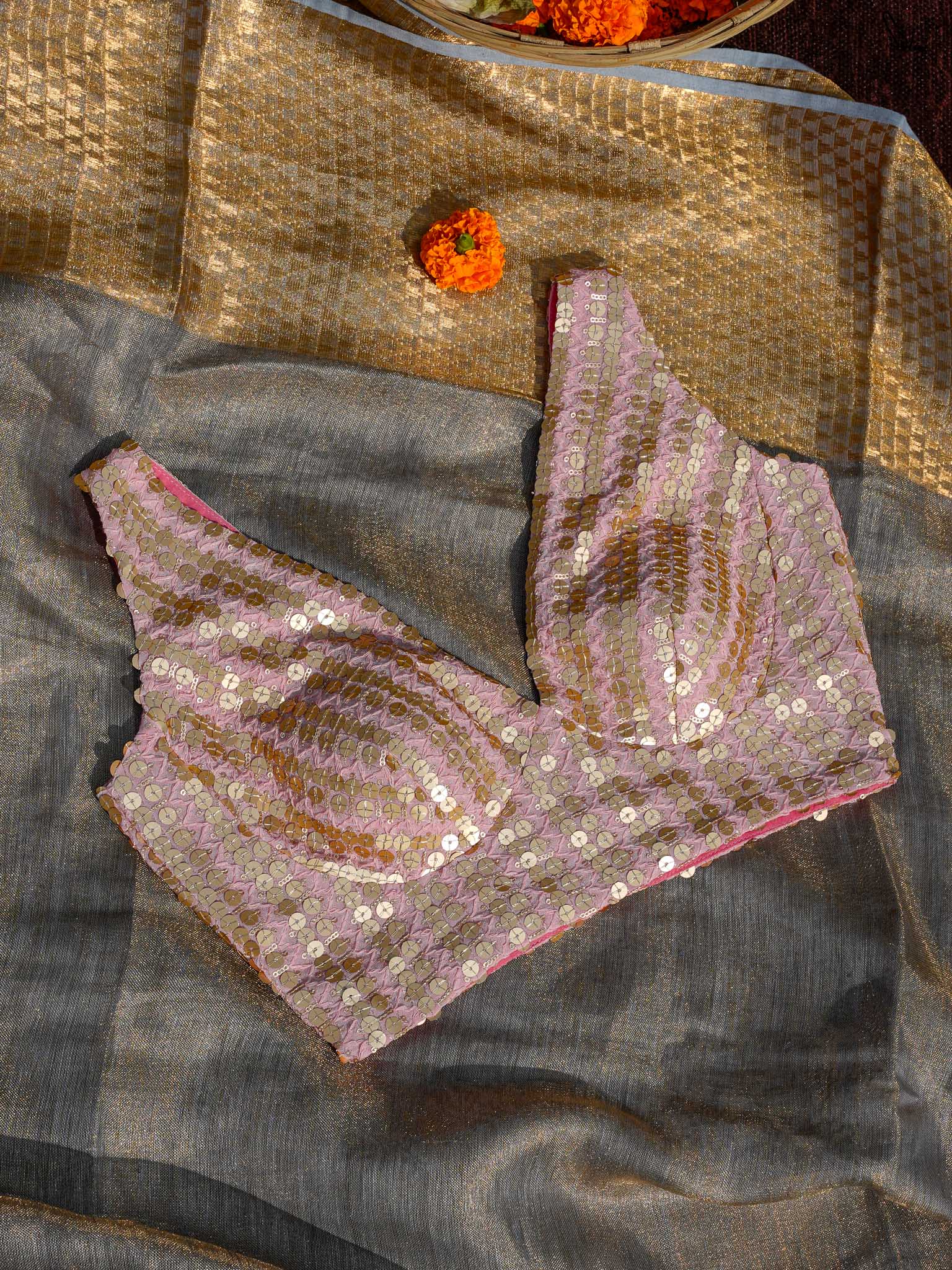 Soft as a secret and radiant as dawn - Asli Chaandi is pure poetry in pink. This sleeveless linen blouse gleams with intricate embroidery that catches the light beautifully, lending it a festive glow. The V neckline adds modern finesse, while the delicate hue keeps things romantic and versatile. Perfect for everything from haldi mornings to evening receptions, this blouse is the real deal - graceful, effortless, and unmistakably you.