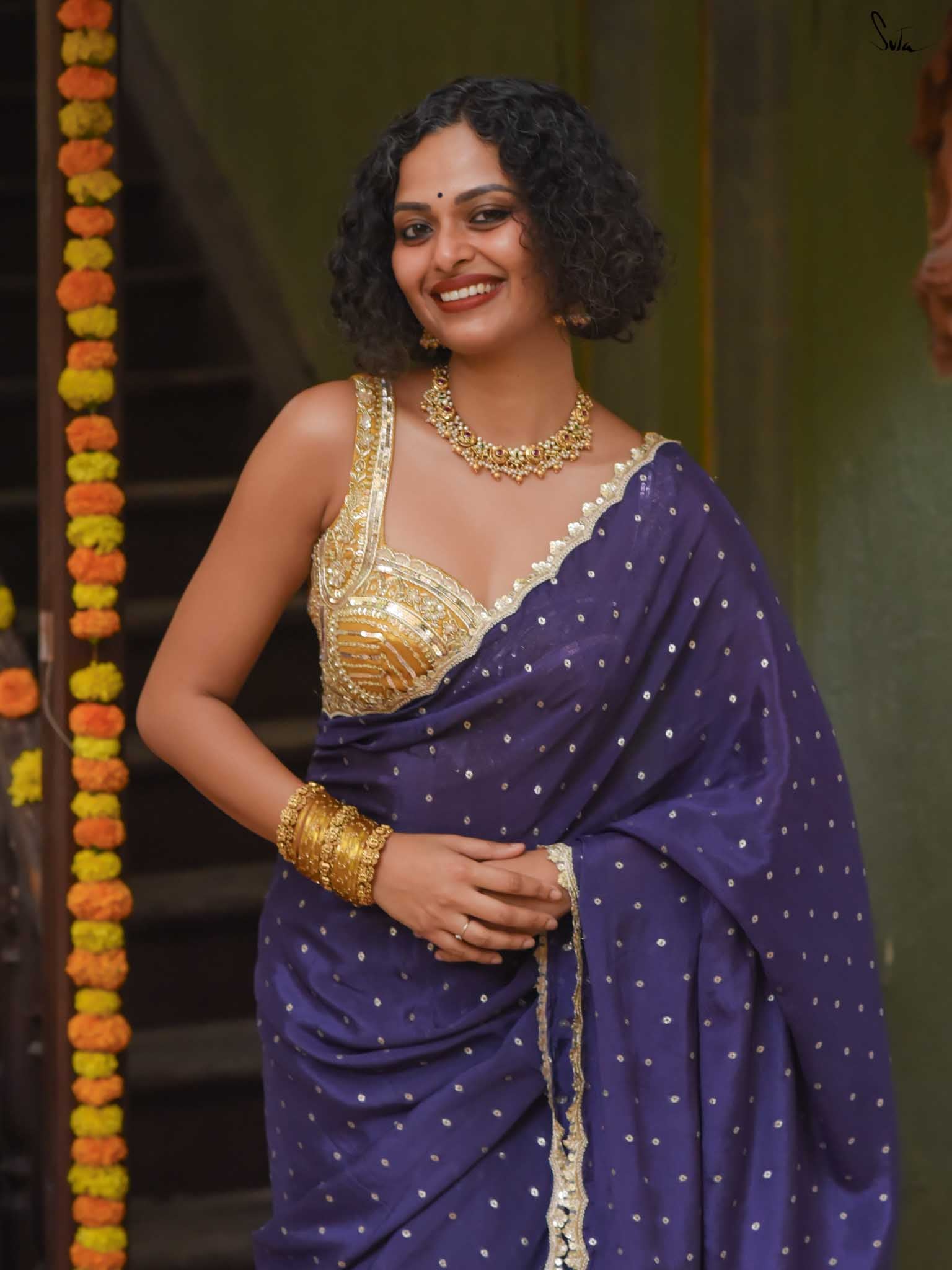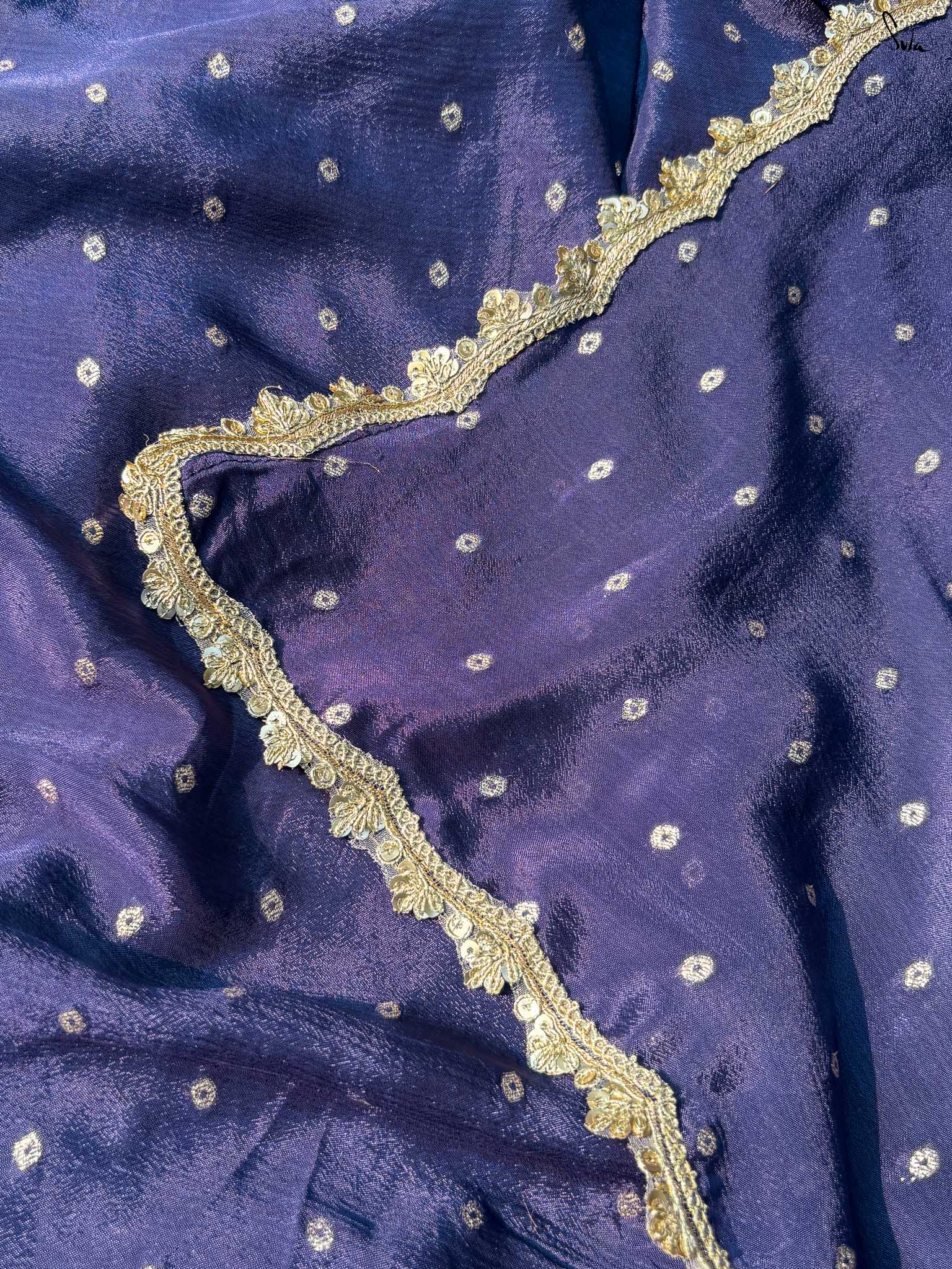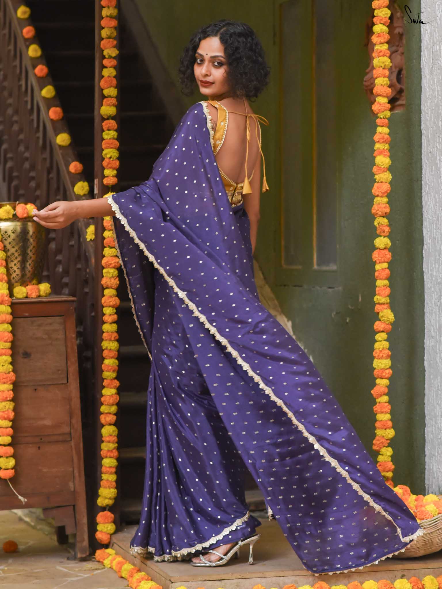 Deep, refined, and effortless - this navy blue viscose-blend saree brings a rich elegance to every occasion. The smooth, fluid drape is dotted with light gold woven buttis, adding a soft glow against the dark base. Finished with an embroidered scallop lace, it carries a polished, timeless charm perfect for evening weddings, receptions, and celebratory gatherings.