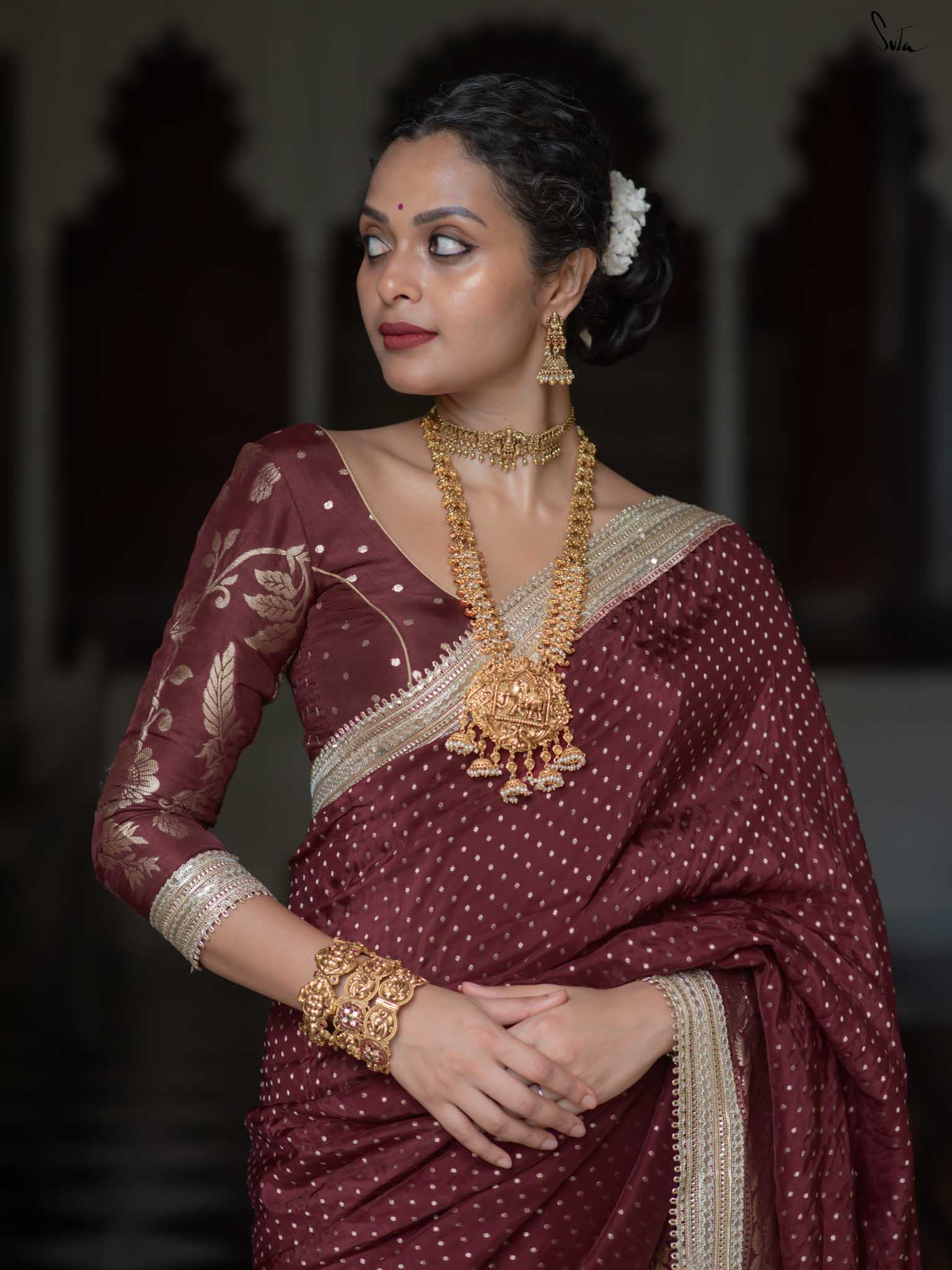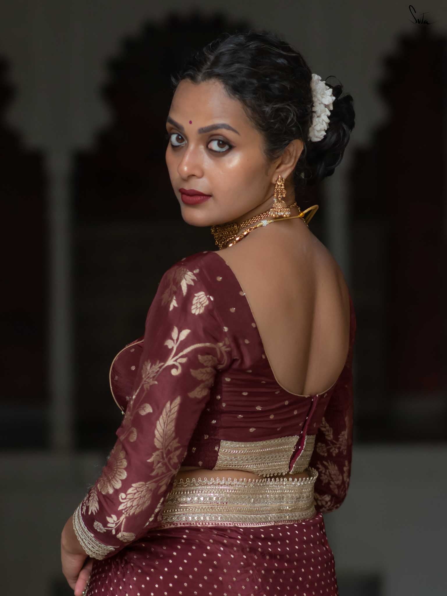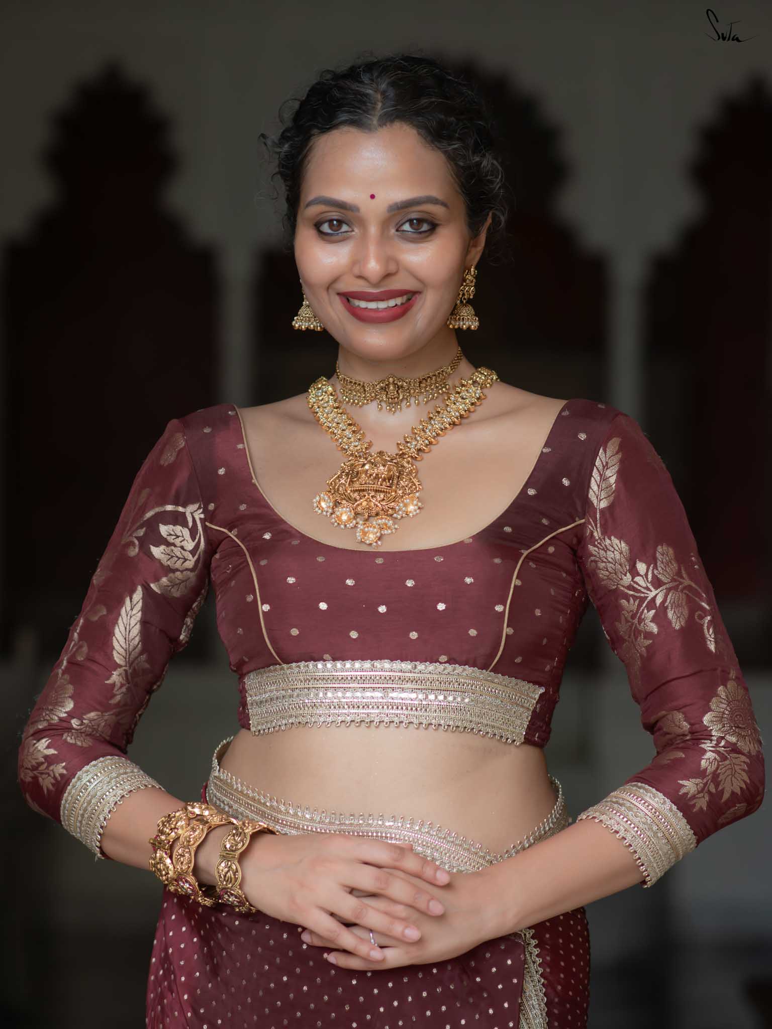Rich in maroon and full of festive drama, Boondi Hai features a round neck, three-fourth sleeves, and embroidered lace on a woven polka and floral jaal base. The back round neck opening completes its classic look, making it a versatile choice for wedding sarees.