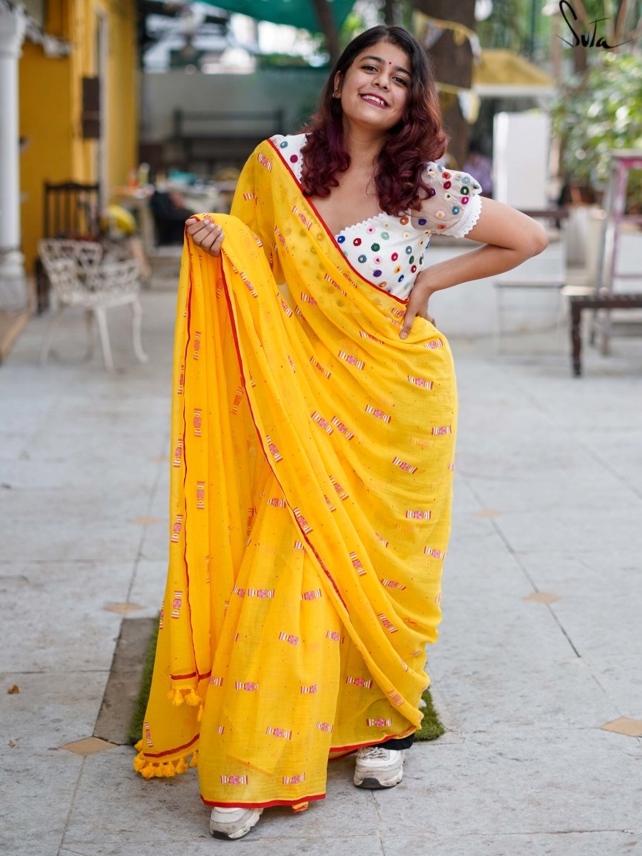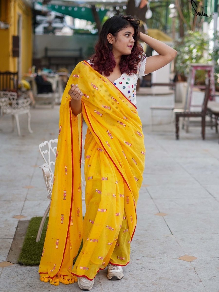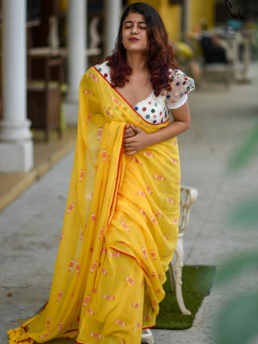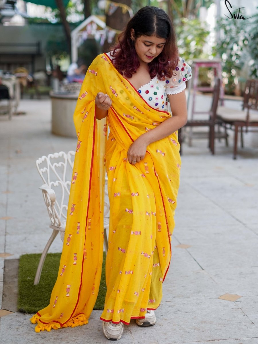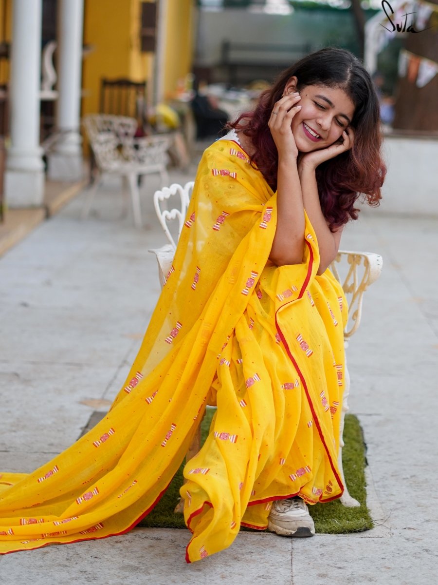 This gorgeous yellow-red mul cotton saree with screen-printed candy design on it calls out to the child in you!