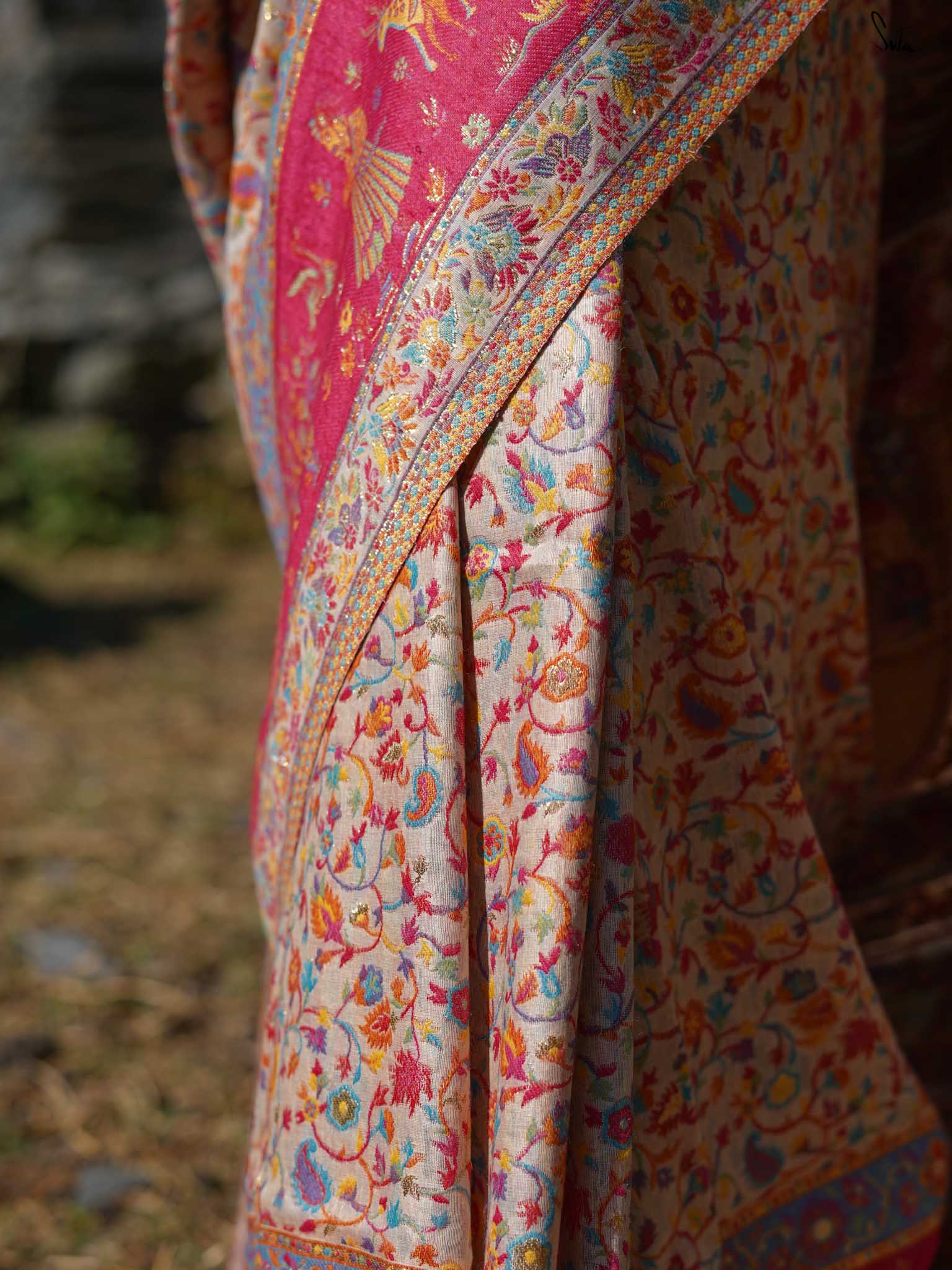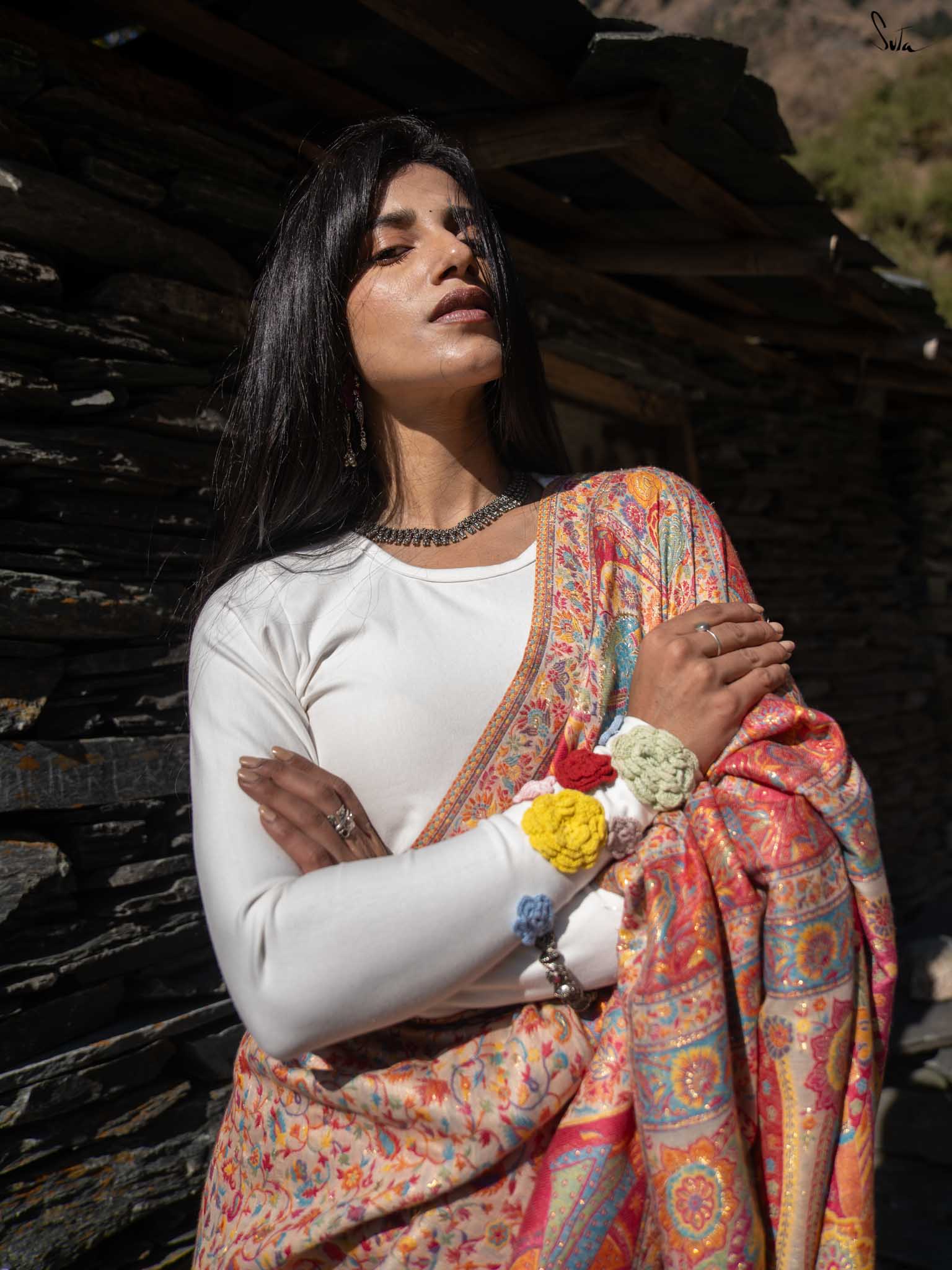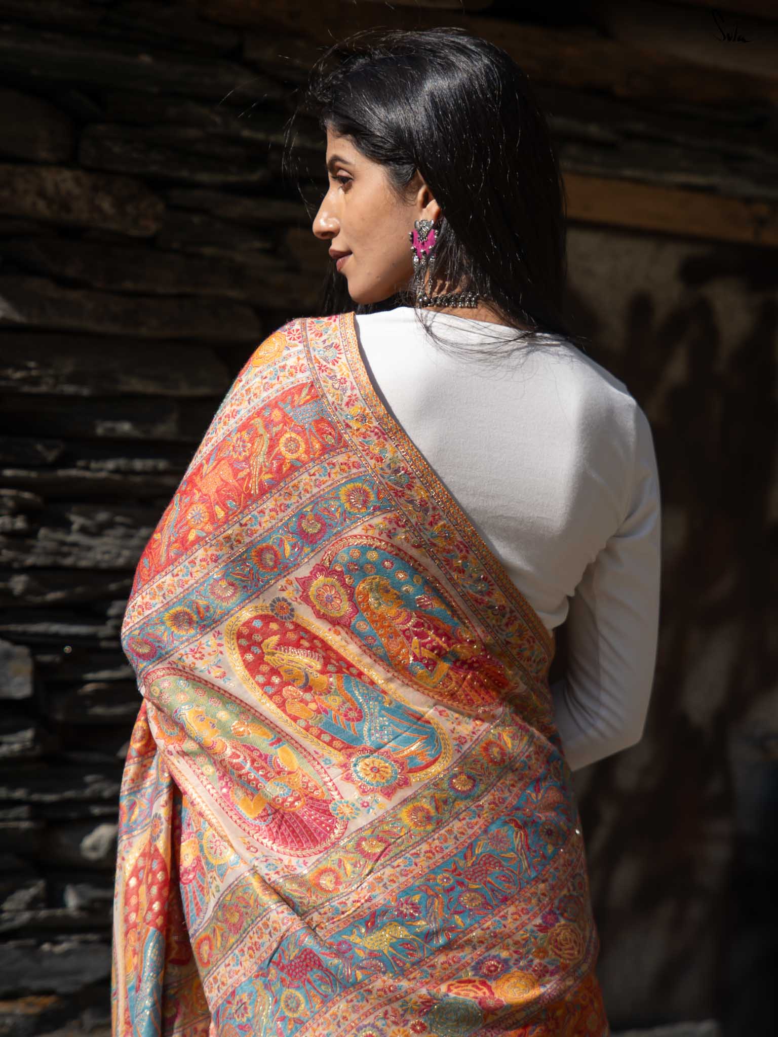 The beige base reflects the quiet beauty of earth, while colourful woven motifs bloom like wildflowers after rain. Graceful and grounded, Deodar Pashm is perfect for the woman who carries quiet strength and endless elegance.