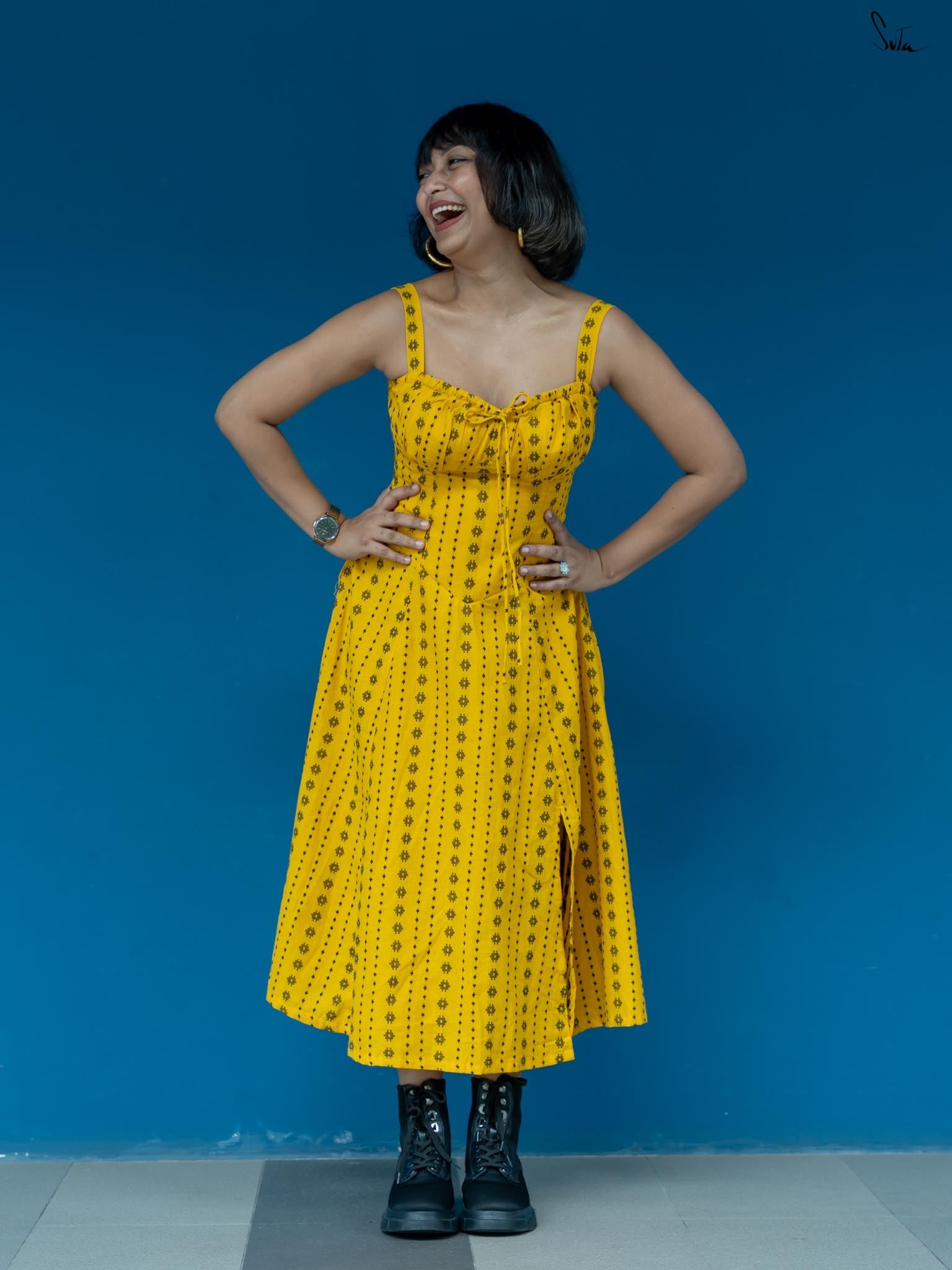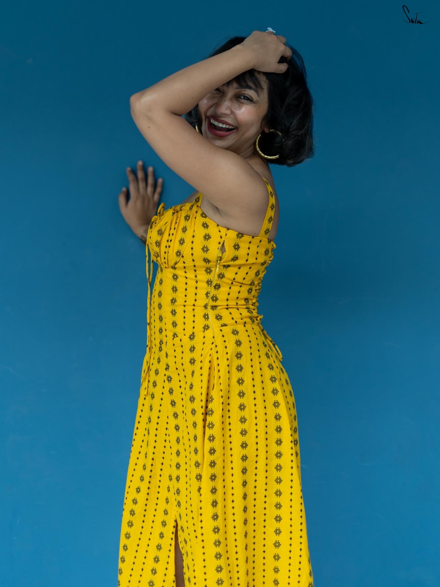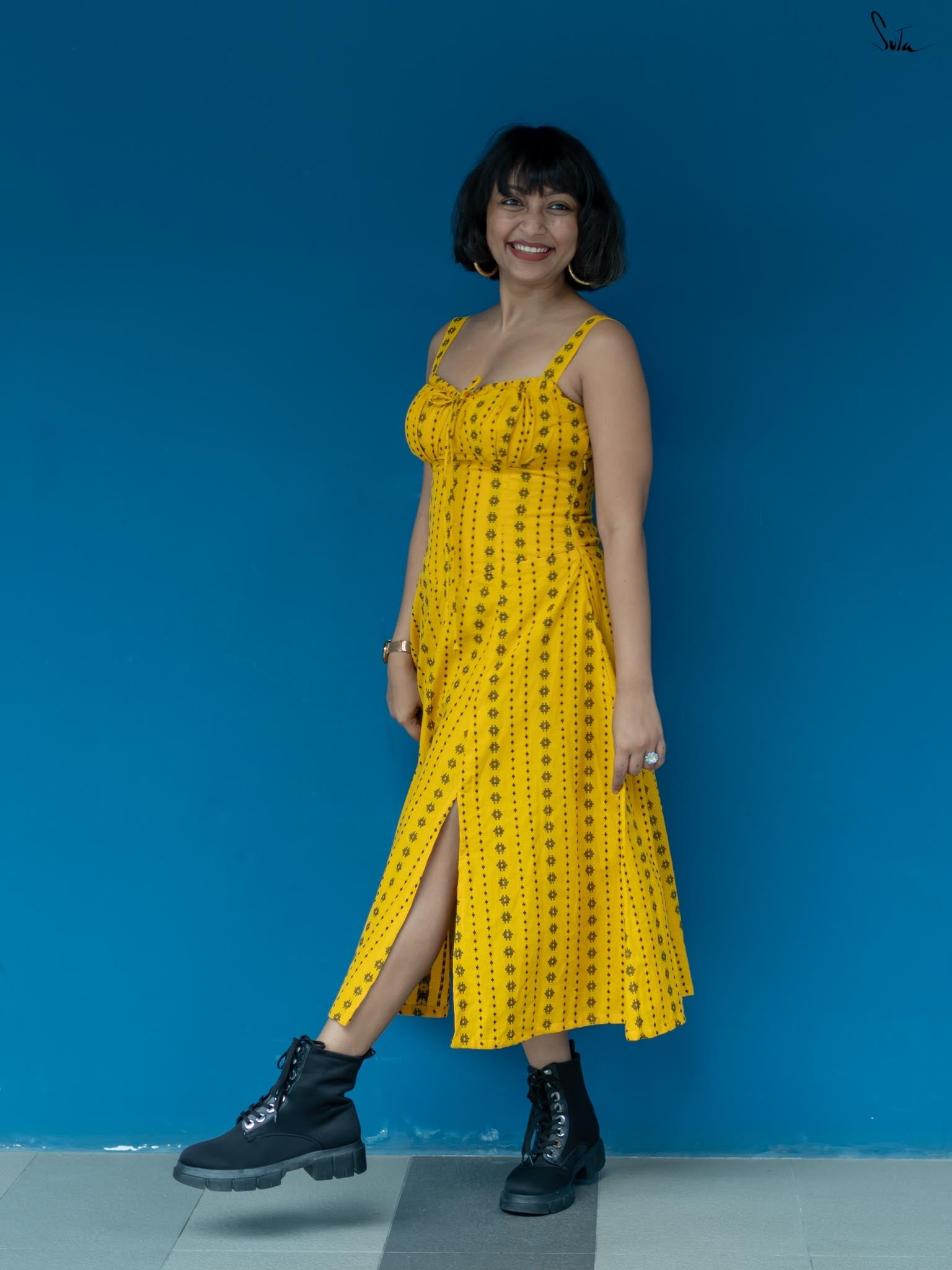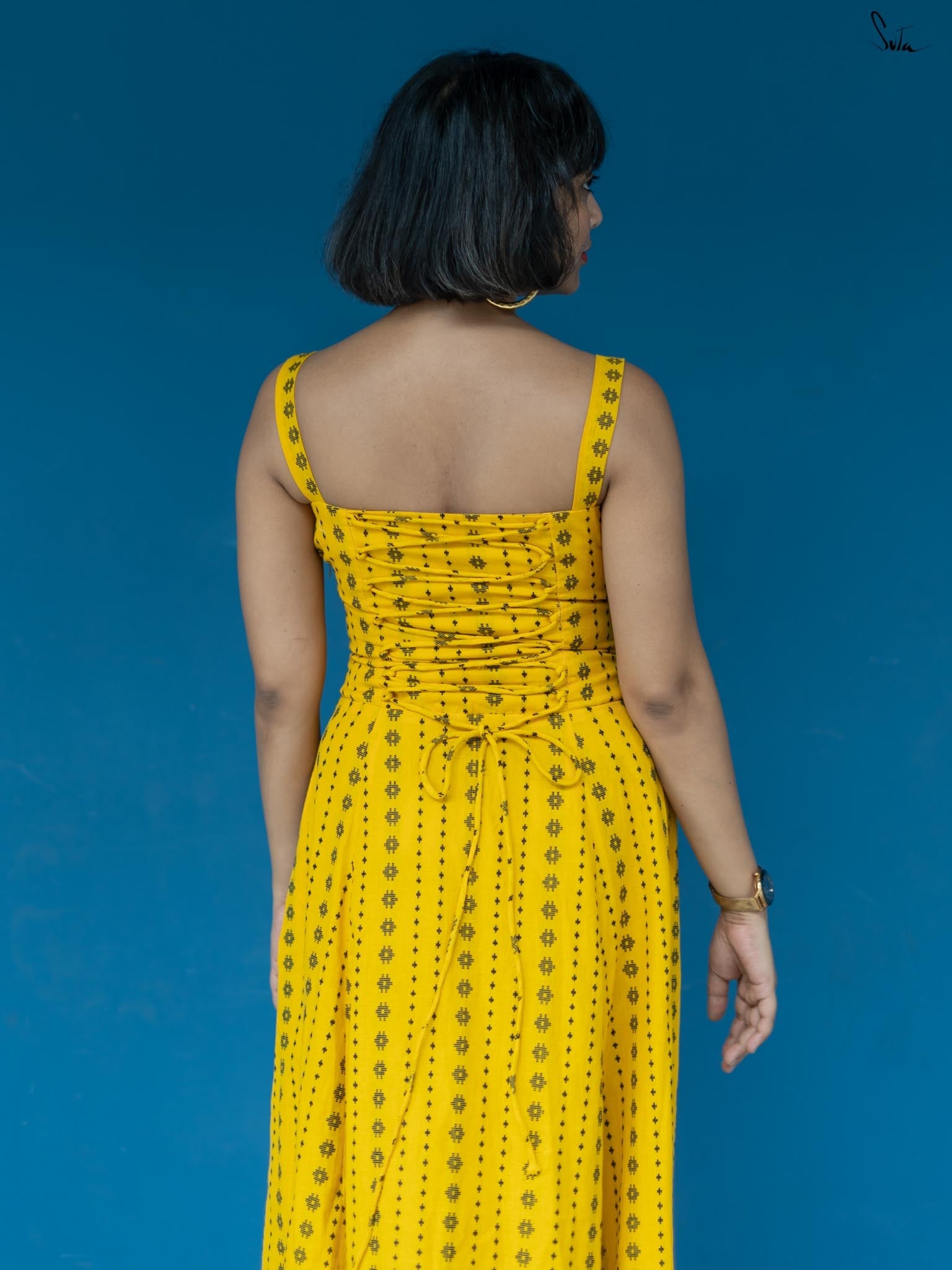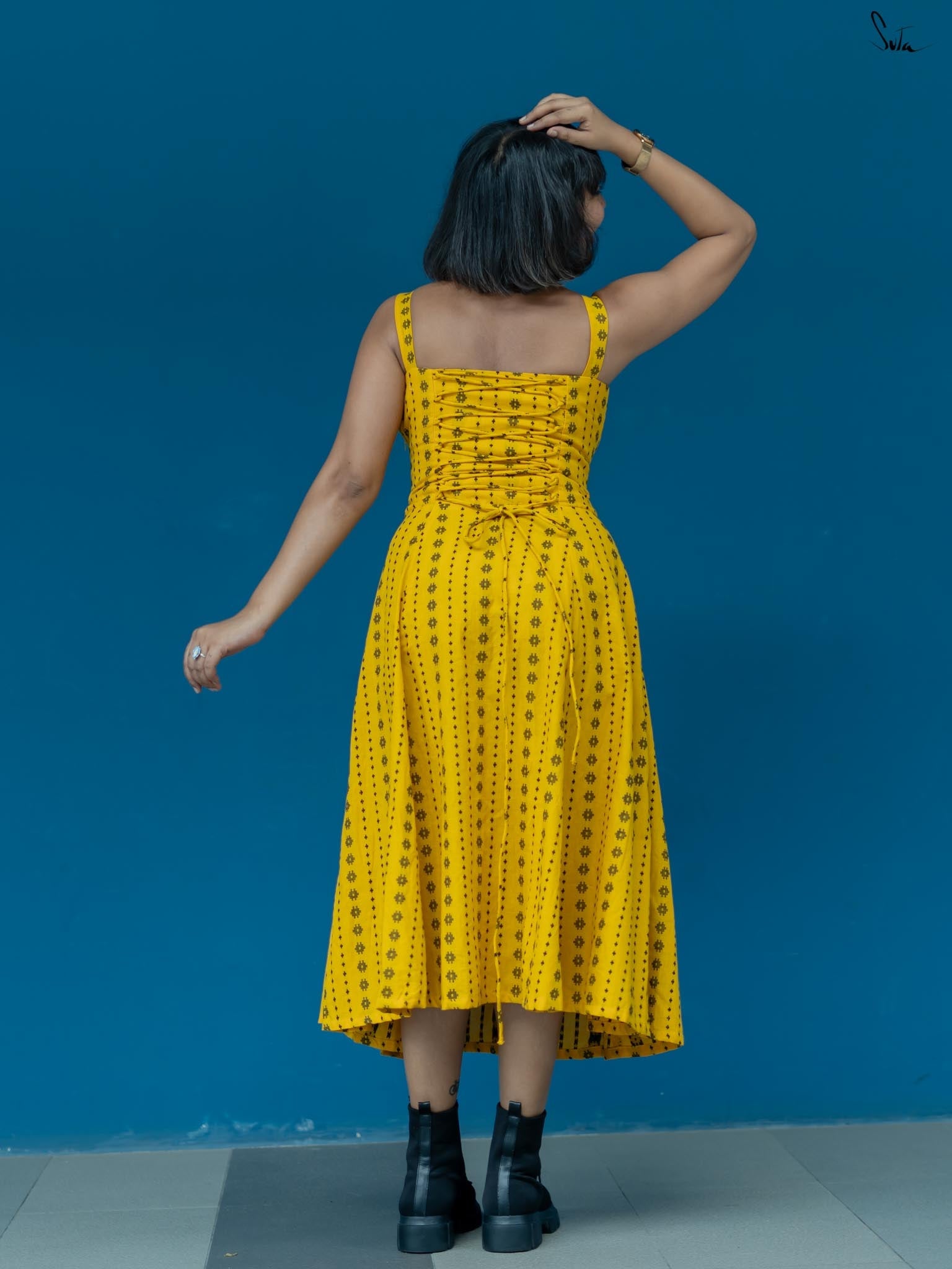 Taking inspiration from the endless hide-and-seek of the winter sunshine, the sleeveless yellow dress is as radiant as a ray of light. Woven from soft, delicate cotton fabric, the dress features a sweetheart neckline and a side zip. Embrace the beauty of 'Dhoop or Chao' and illuminate your surroundings with its warmth and energy.