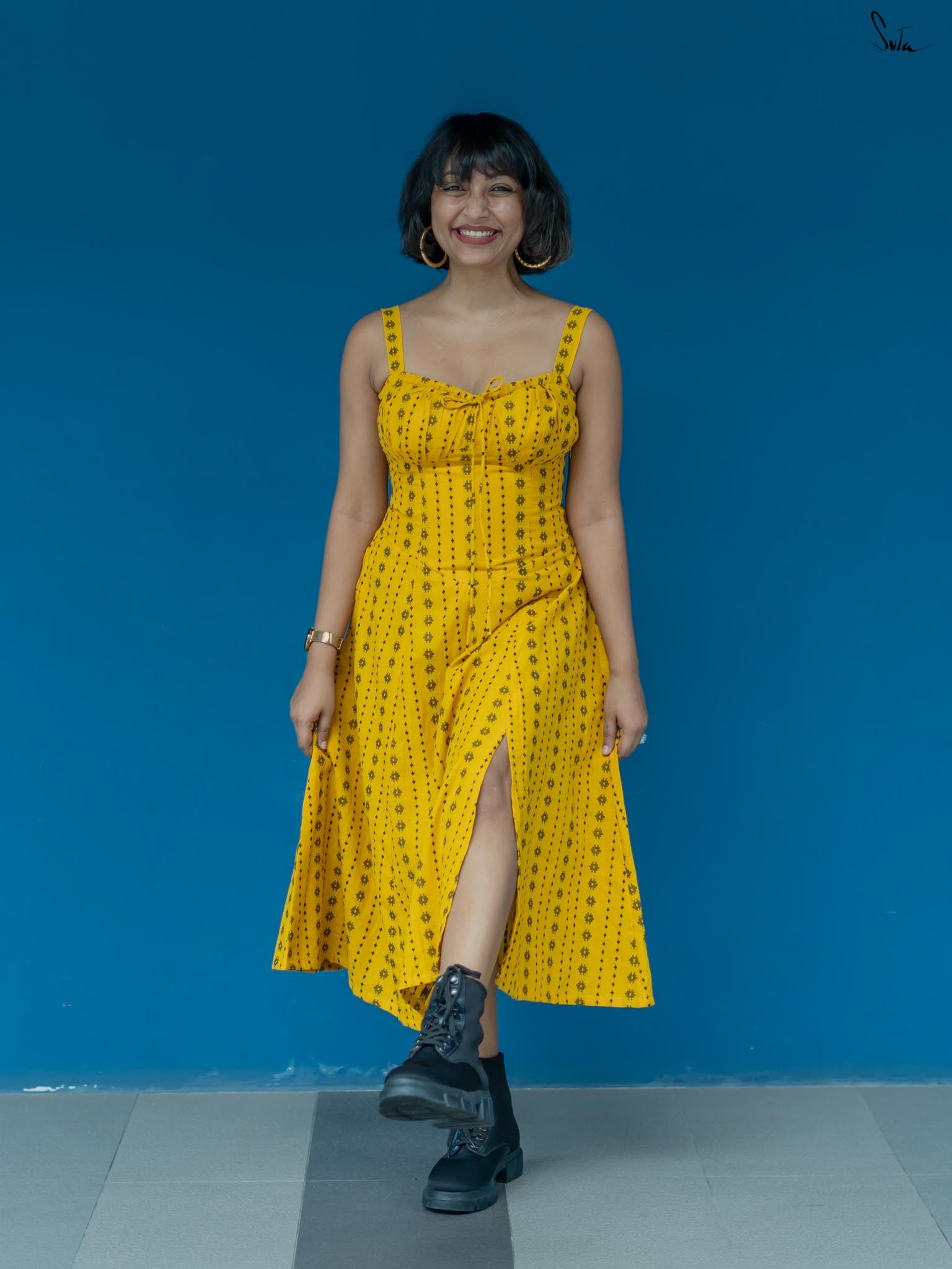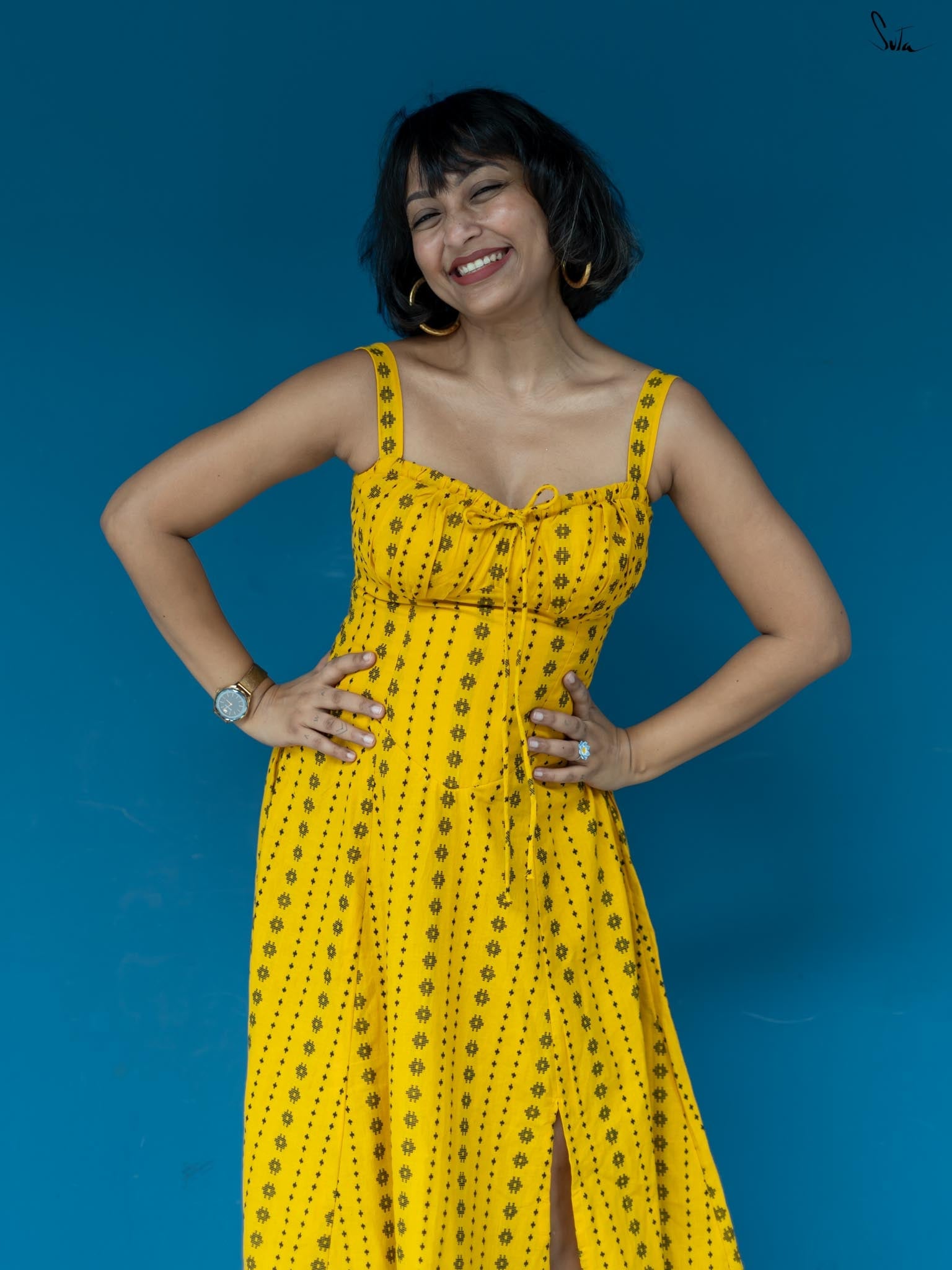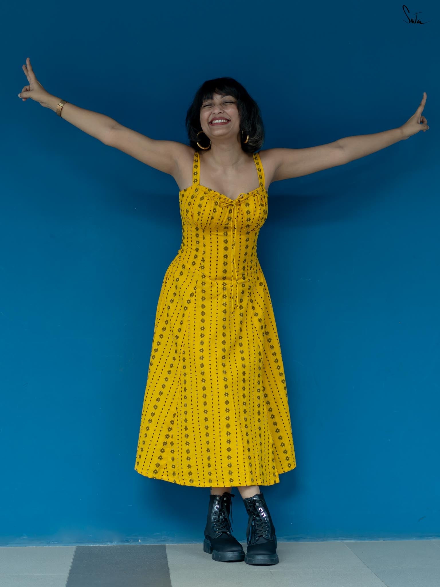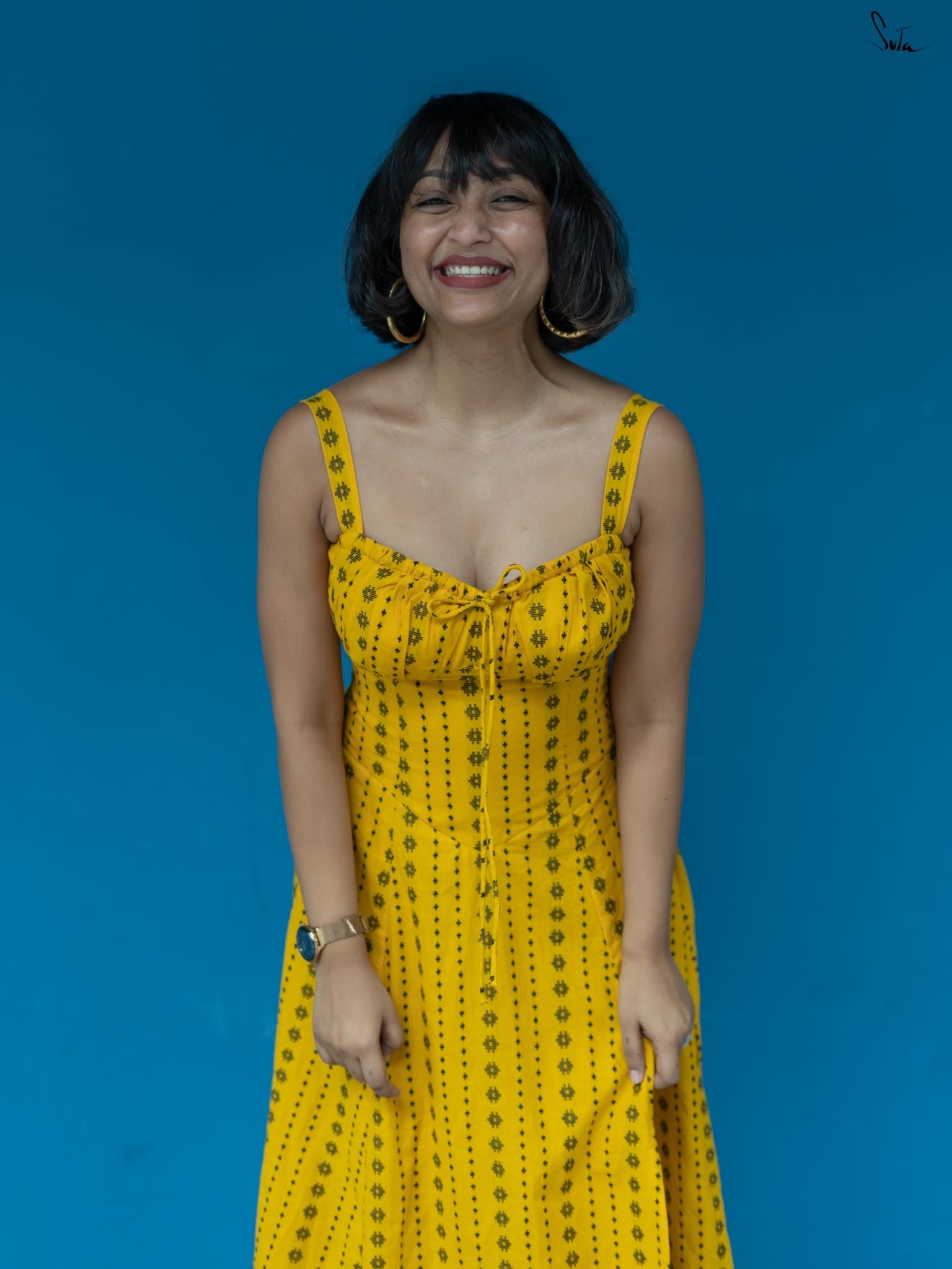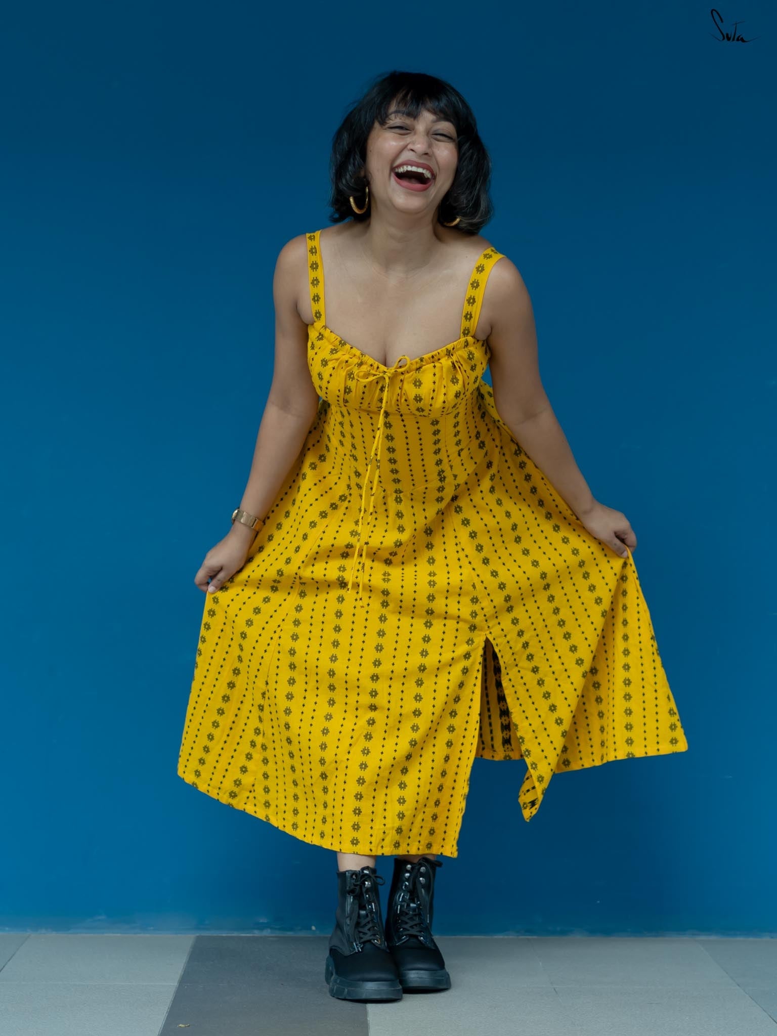 Taking inspiration from the endless hide-and-seek of the winter sunshine, the sleeveless yellow dress is as radiant as a ray of light. Woven from soft, delicate cotton fabric, the dress features a sweetheart neckline and a side zip. Embrace the beauty of 'Dhoop or Chao' and illuminate your surroundings with its warmth and energy.