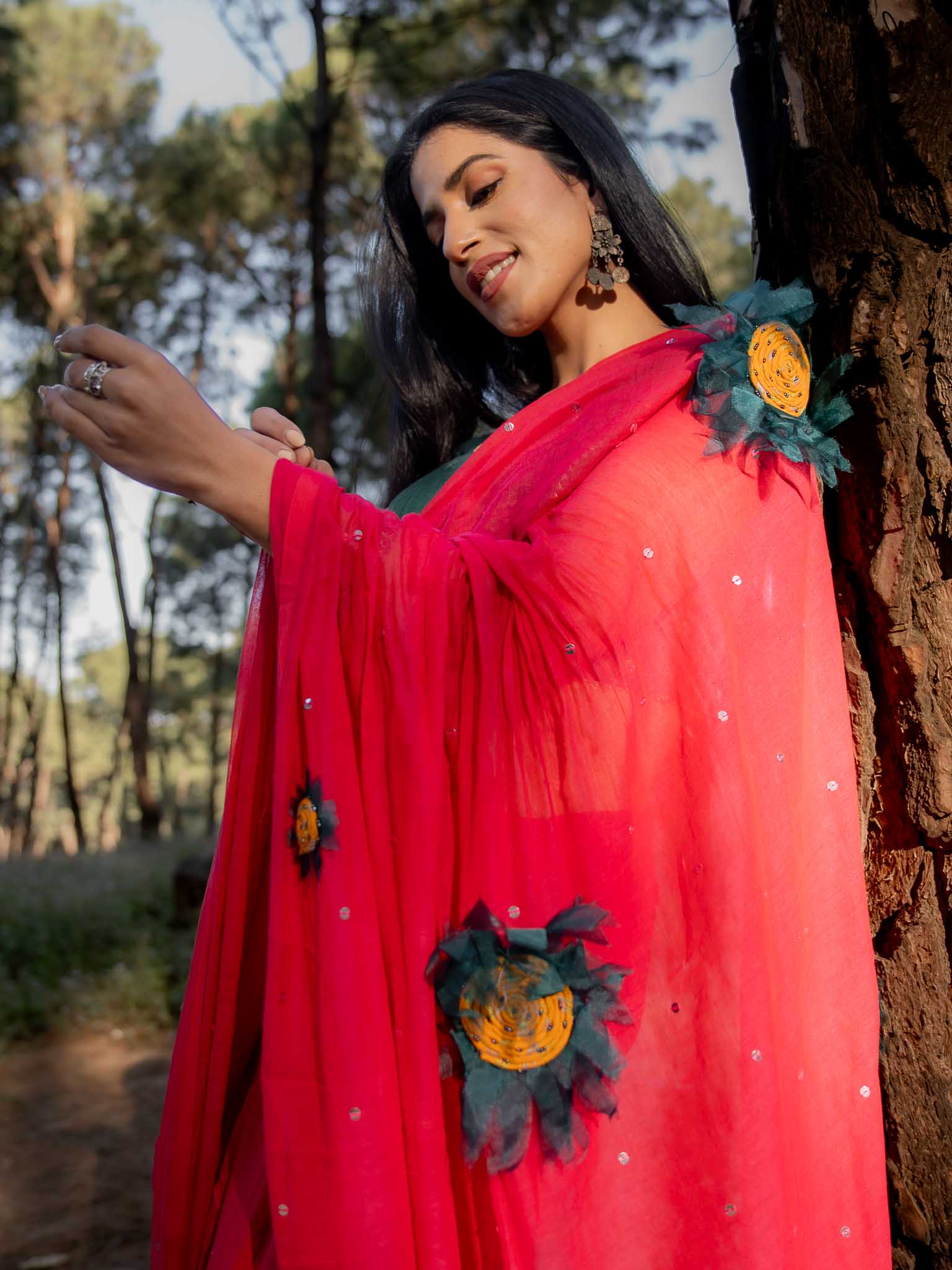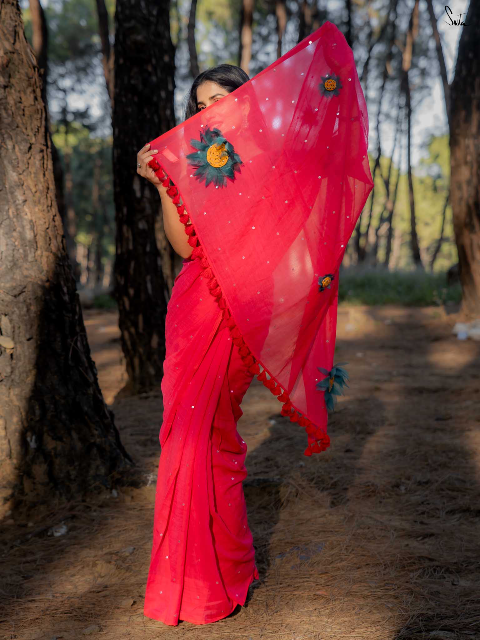 This saree is a playful splash of colour, crafted in whisper-soft mul cotton that feels like second skin. The vibrant pink hue brings instant cheer, turning every moment into a bright, blooming one.