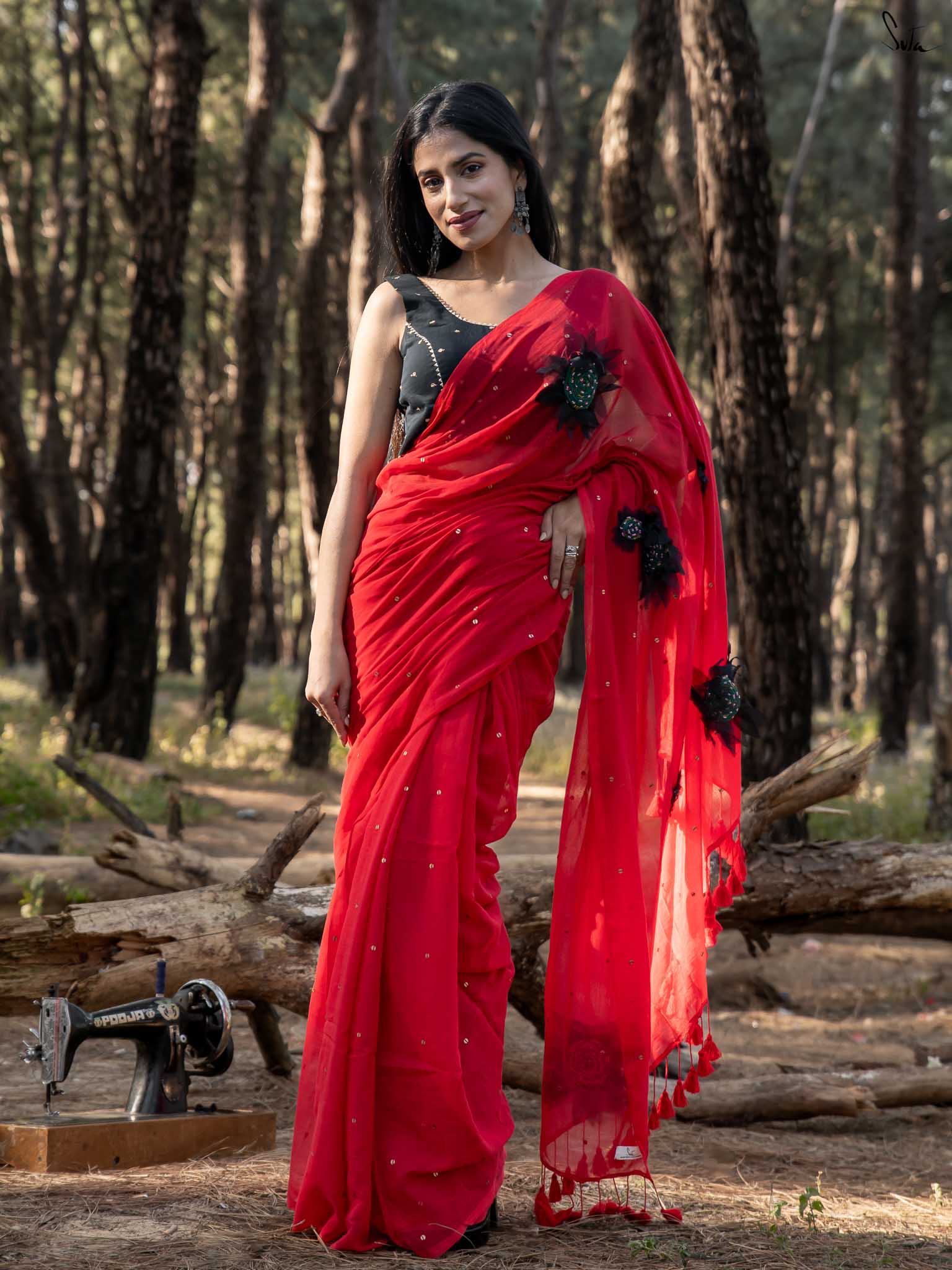 This saree is a burst of warmth woven into the softest mul cotton. The fiery red base feels like a sunset you can wear - light, breathable and oh-so-comforting against the skin.