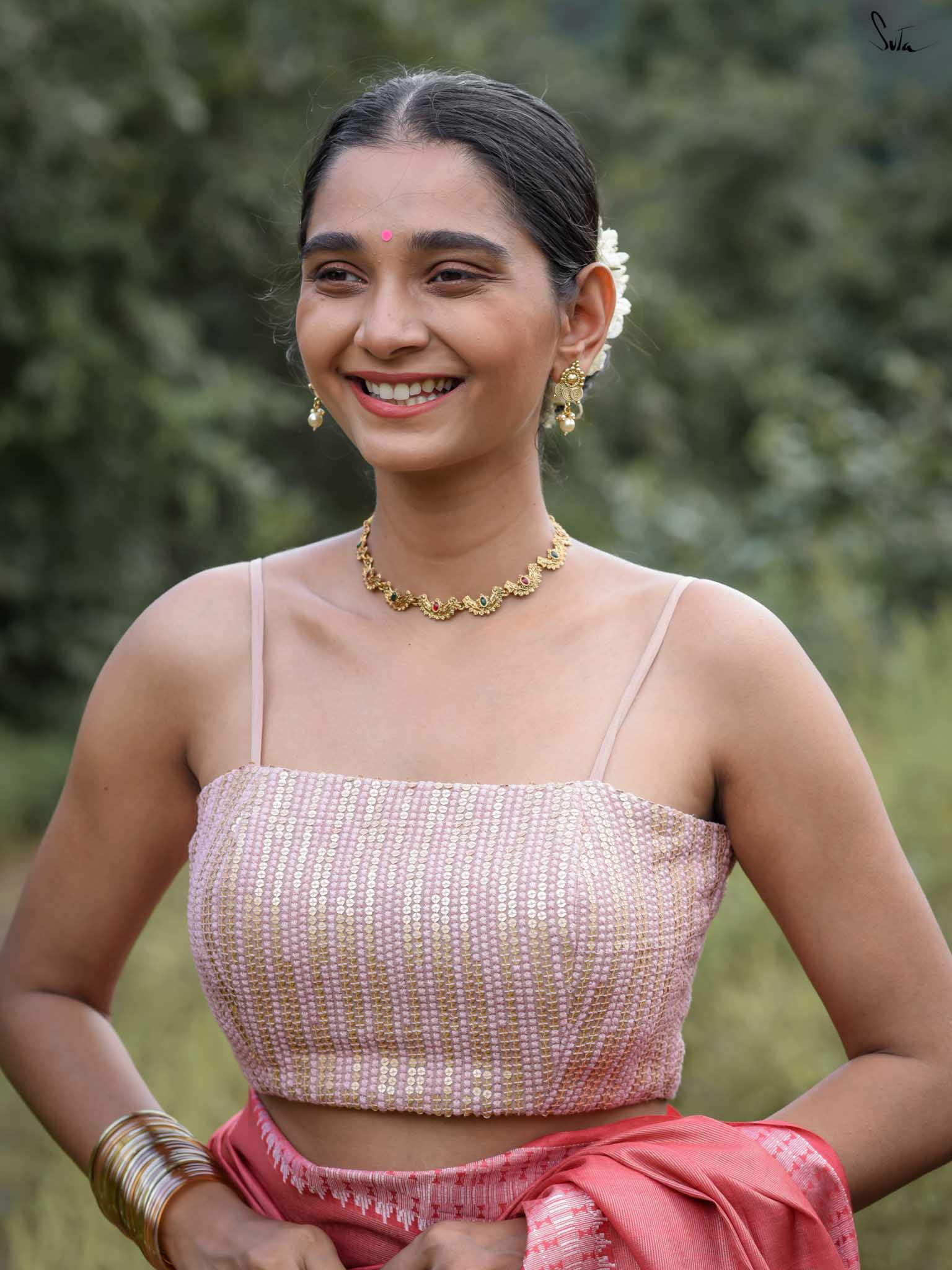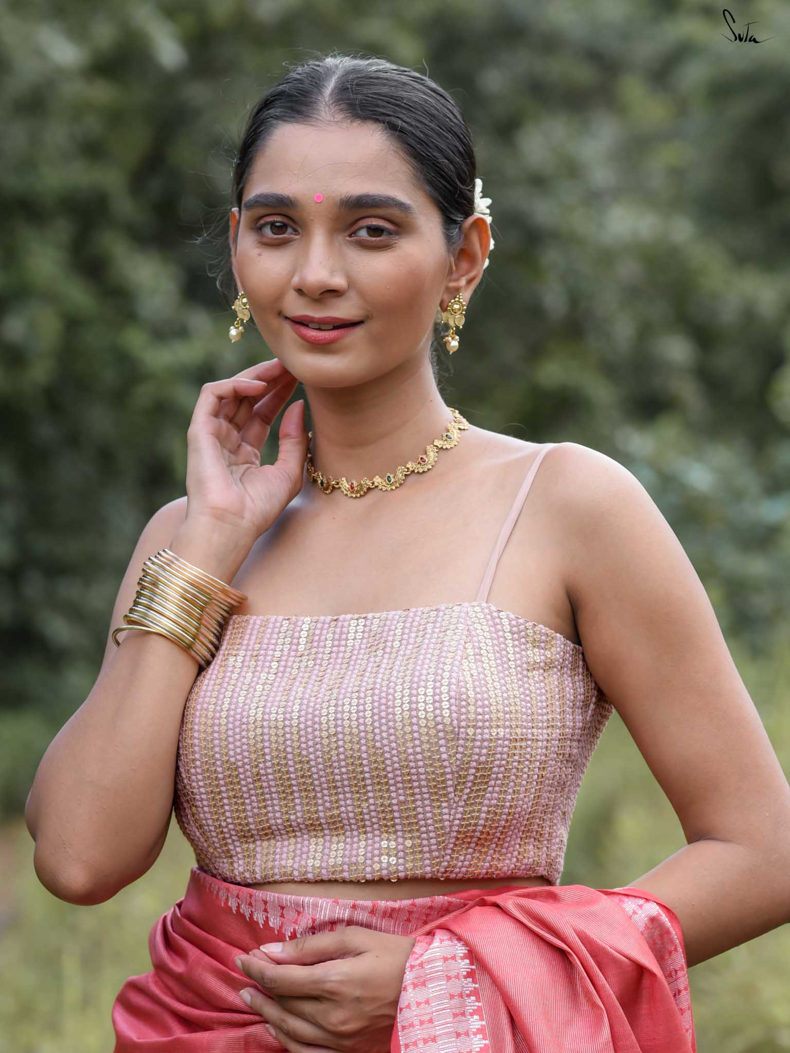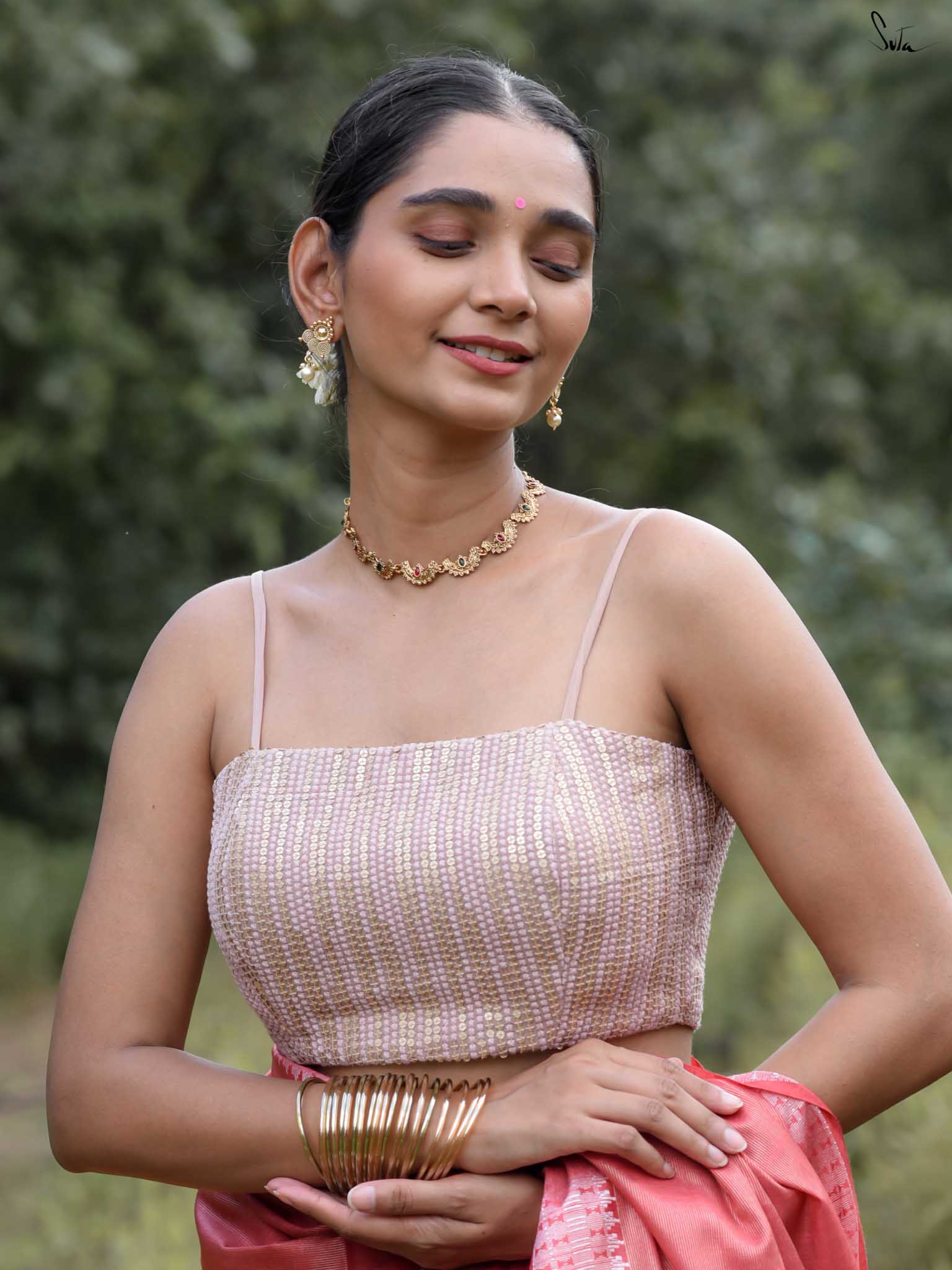 When the moment calls for a little sparkle, Full Chaandi answers. This baby pink blouse shimmers with delicate sequin embroidery that catches every flicker of light. The square neckline and dainty spaghetti straps lend it a modern, romantic charm that’s perfect for weddings, cocktails, or festive evenings under fairy lights. Light, luminous, and full of joy, it’s your cue to shine, head to toe.